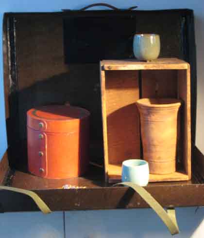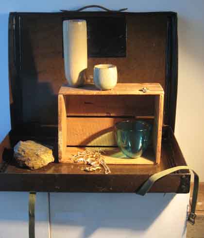 Here, I experimented with a tall vase to replace the small cup sitting on top of the crate, and then with a black cup. I thought that the black cup was more harmonious and didn’t detract from the jewelry and blue bowl, which I decided would be the focal point.