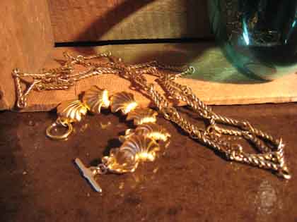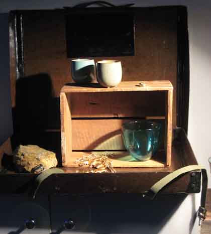 The things I chose seem to be fighting each other for attention, so I selected some quieter, smaller ones. I wanted some more contrast in textures, so I decided to use a blue glass bowl and a rough rock. Also, I felt that the setup needed some detail, so I added the gold jewelry. I liked the way the jewelry was reflected in the blue bowl. I rearranged one of the straps of the portfolio to echo the curve of the shadow cast by the blue vase.