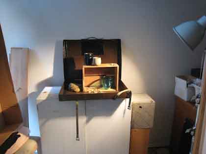 I bought an old waxed cardboard portfolio at an antique market recently. I thought it might serve well as a background for a still life set-up, or as a base, or both. Here, I’ve placed it on a table, opened up, shone a spotlight on it, and gathered a few objects that might work with it.
