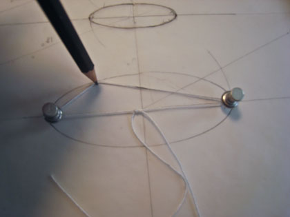 Armed with this number, and the length of the major axis (the diameter of the circle in the drawing),  I can calculate the correct ellipse. This I do using string, two pins, and a pencil. (I’ll explain in more detail how to do this in a future post.) It’s low-tech, but it works!
