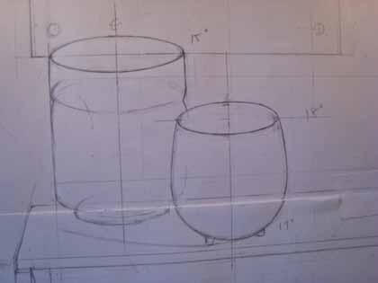 I establish the vanishing-point so that my perspective is realistic. The vanishing point is at my eye level and directly in front of me. I mark this on the paper (or on my easel, if it’s off the paper!). All parallel lines will converge to this point. Circles in perspective are drawn as ellipses. The closer the circle is to my eye level, the more shallow the ellipse, the further down, the closer to a full circle. To draw these accurately, I have to find the circular object’s angle below my line of sight. To do this, I run a string from a post at my eye level to the circular object in my set up. I measure the angle the string makes with the post with a protractor.