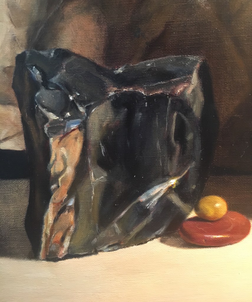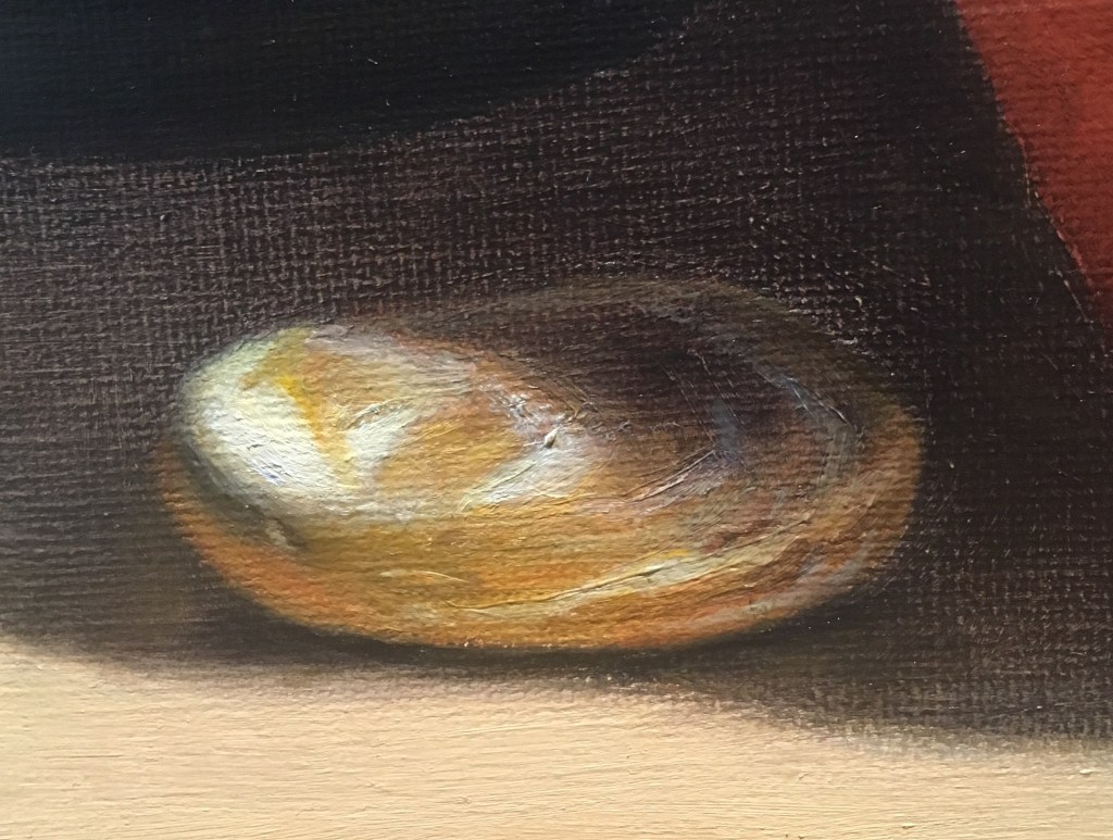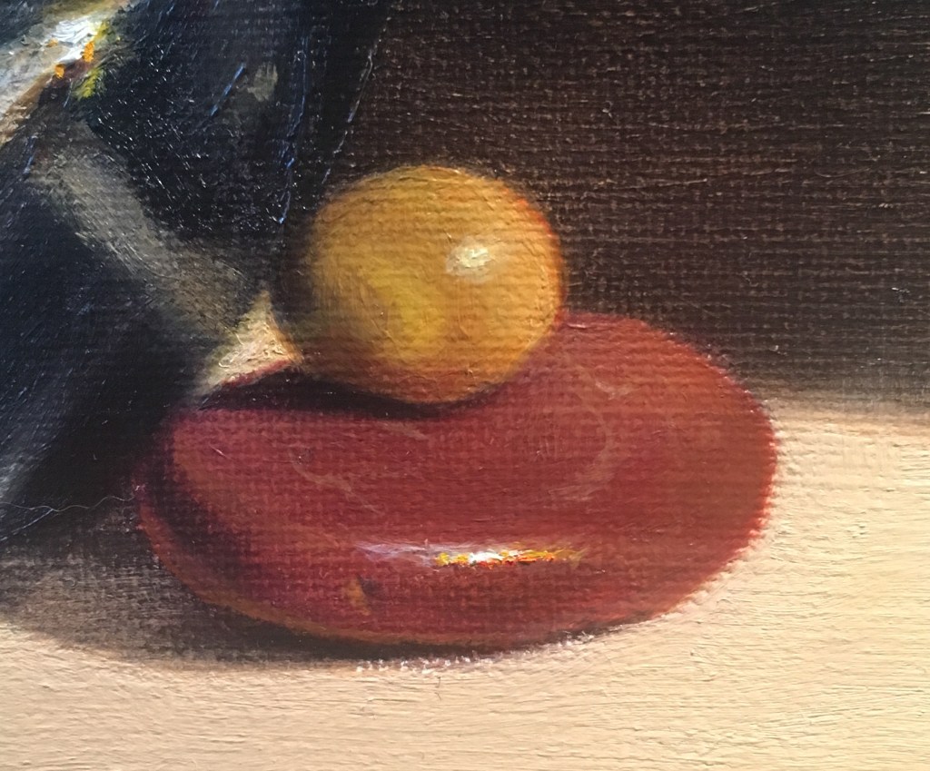 When viewed from a distance, the painting is mostly finished at this point. The composition is complete. The large areas of light and shade as well as the colors are set. All that remains is to refine the details. Many of these will only be discernable up close, but to me, they are a large part of what makes a good still life so interesting to study. The subtleties of reflected lights, lost edges, colors in highlights, colors in the shadows all enhance the feeling of a heightened reality.