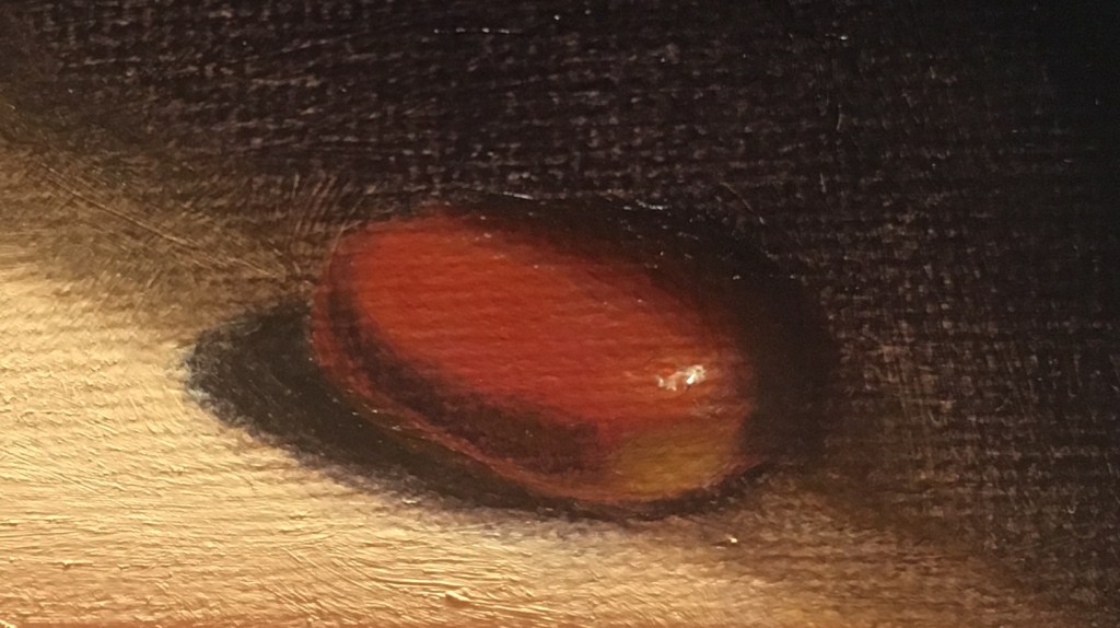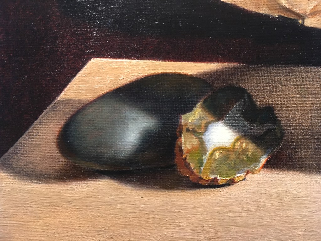 I softened edges on the orange stone, and darkened the light reflected up from the table onto it’s bottom side. I worked on making subtle transitions in color and value in the double shadow that crosses it.