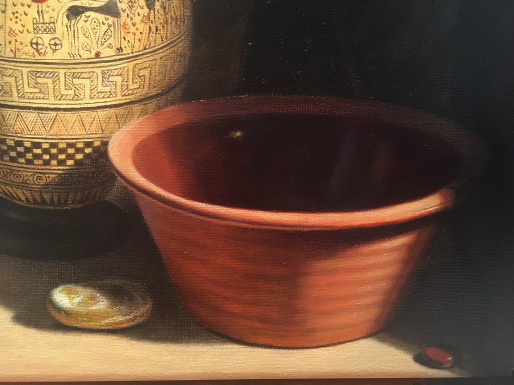 On the orange bowl, I lightened the left upper rim towards the back where it turns into shadow, so that it is lighter than the vase behind it. I added some pure cadmium red to the upper edge of the front rim to show the light bouncing off of it contrasted with the dark interior. I brightened the highlights on the right side of the front of the body of the bowl, and lightened the bottom where it catches reflected light from the tabletop below.