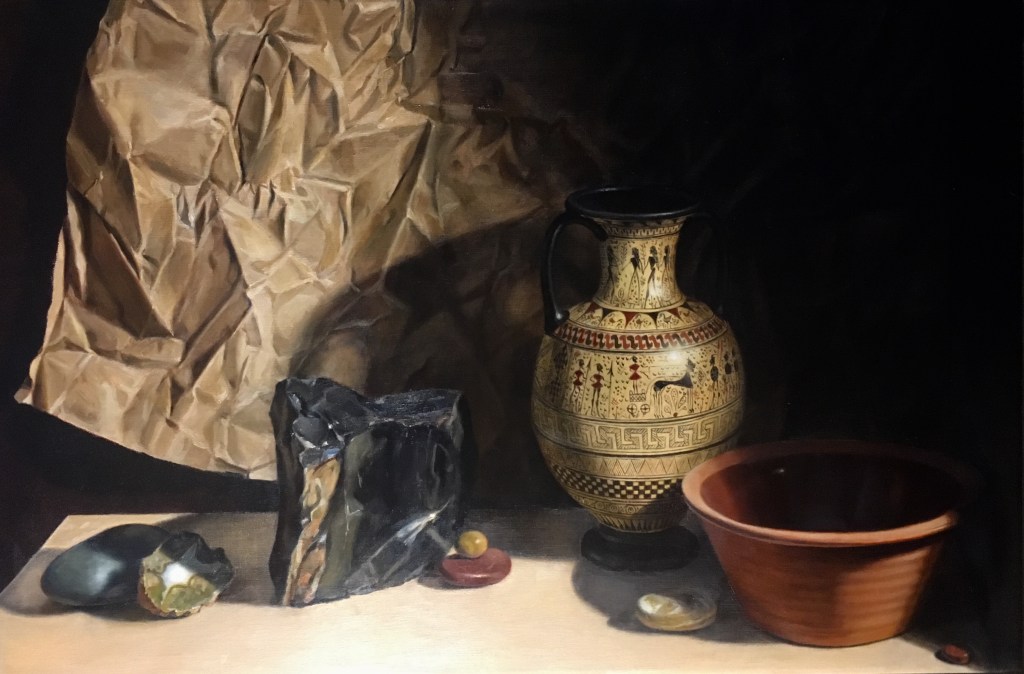Here’s what the painting looks like now. I think that I’ll put it away for a week to get some distance from it. If I’ve been working very hard on a painting, I can develop blind spots and it can be hard to make judgements. I don’t want to wait too much longer, though. If too much time passes, I lose my connection to the painting process and it’s very difficult to get back in the proper frame of mind to continue. Maybe when I look at it next week, something will strike me that needs changing. I wonder if I need to keep working on the paper. I know that I could keep refining it, but eventually to diminishing effect. I have to reach a point where it looks real and rewards close study, but not where it looks over-labored and focus-pulling. The vase- not the paper- is after all, the focal point!