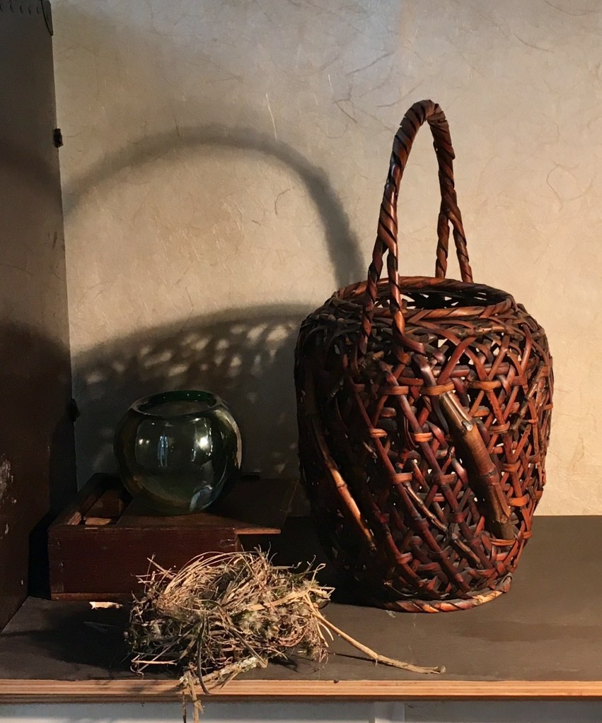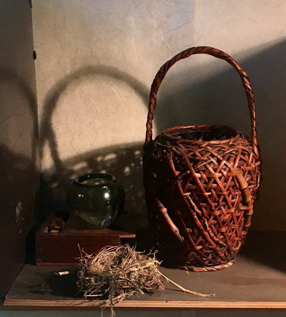 I moved everything over to a different table. I used a darker board as the tabletop, but decided to keep the rice paper on the wall. I missed seeing the shadow cast by the loose weave of the basket in the first set-up, so I put the basket on the right side to leave more room for its shadow. All of the other objects now fit to the left of the basket, instead of on the right, as before. Otherwise, their arrangement is similar. The green glass box is now in shadow. I think that I prefer this. The nest stands out a bit more against the darker tabletop.