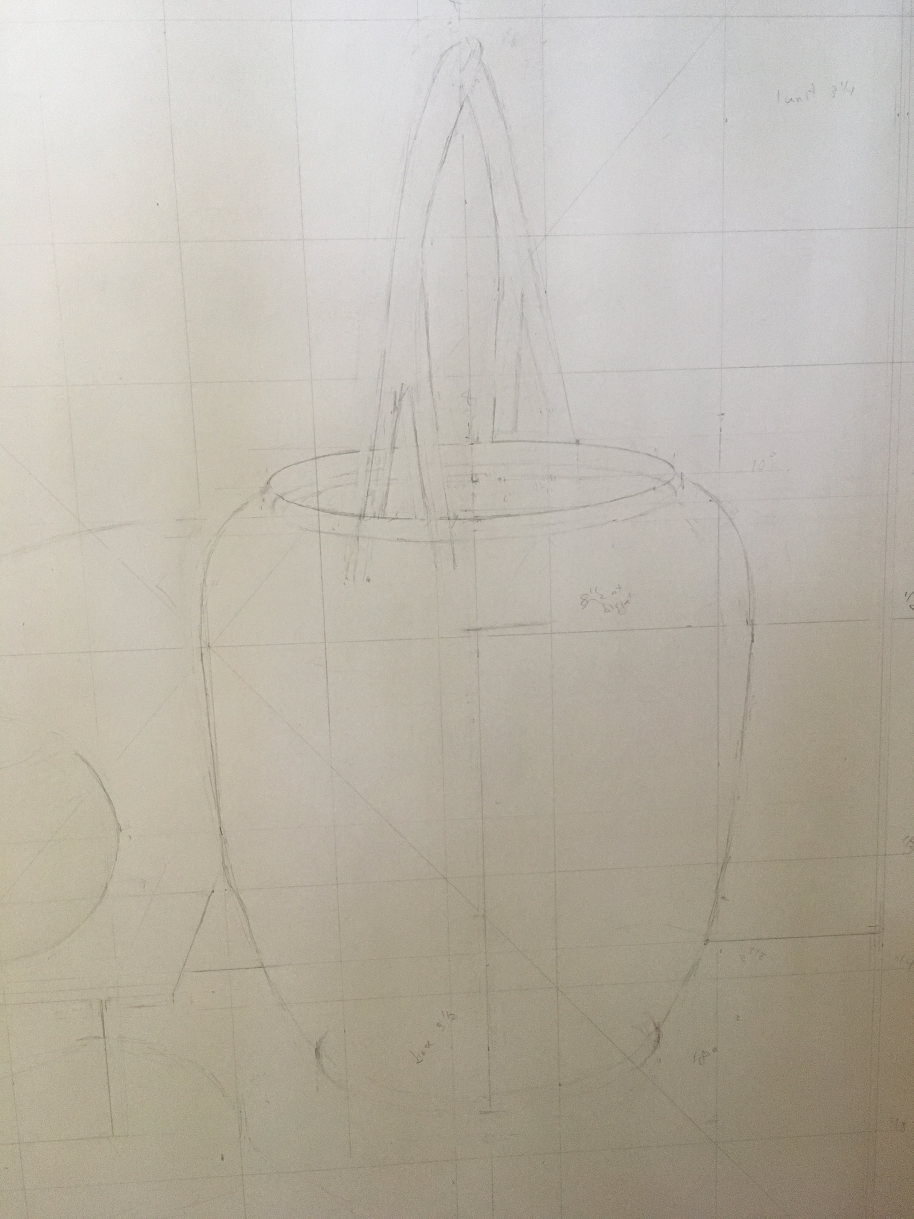 I saw that I drew the bowl too far over to the right, so I moved it over to the left. I saw that in moving it, I got the shape wrong. Both sides did not have the same curve. I remedied this by tracing the correct side onto a piece of tracing paper, being careful to mark the position of the center line. I then flipped the tracing paper over, lining up the center line and traced over the curved line to produce a mirror image on the other side. (The graphite from the original line acted was transferred to the paper.) This is my go-to method for achieving symmetry.