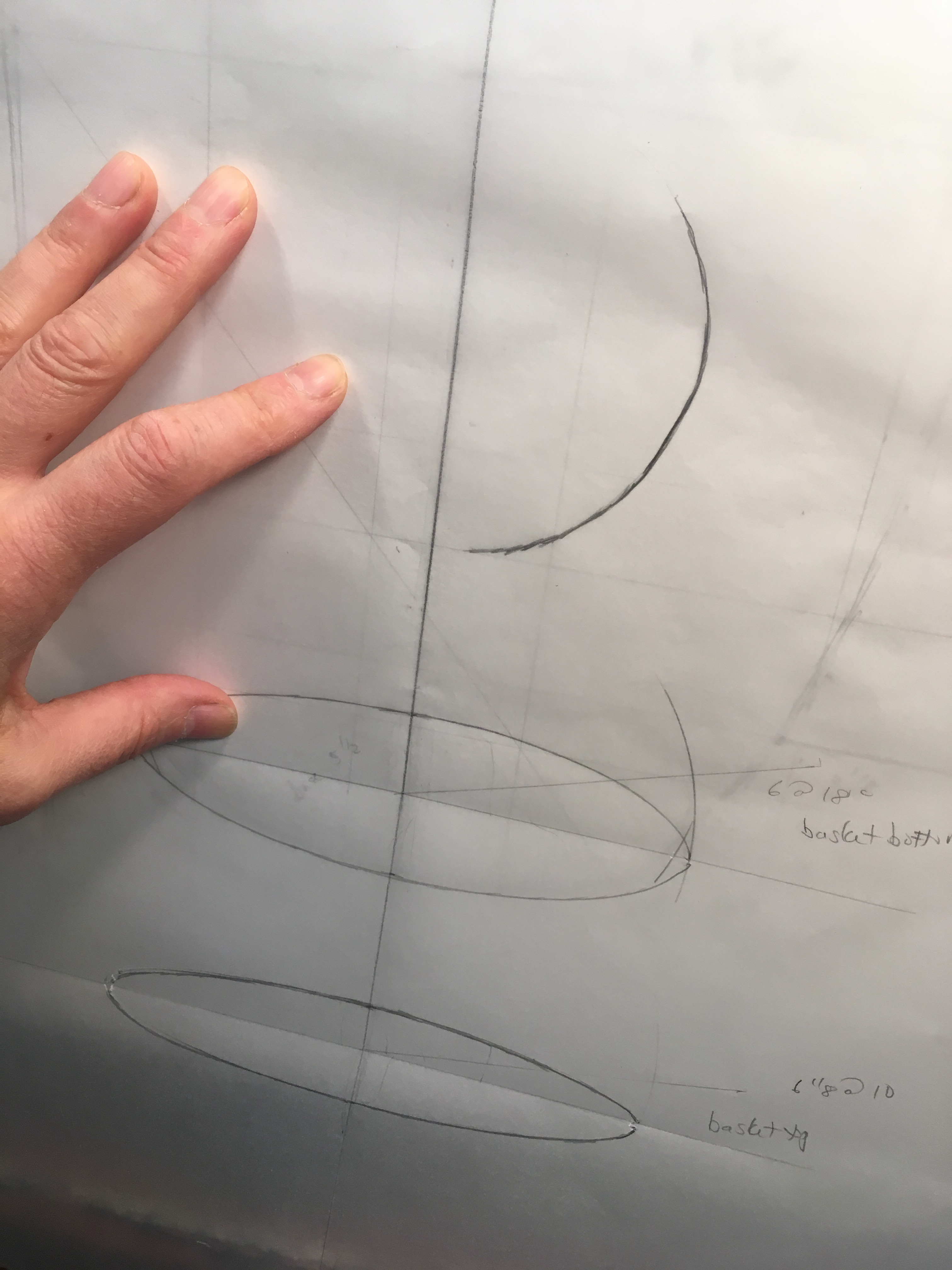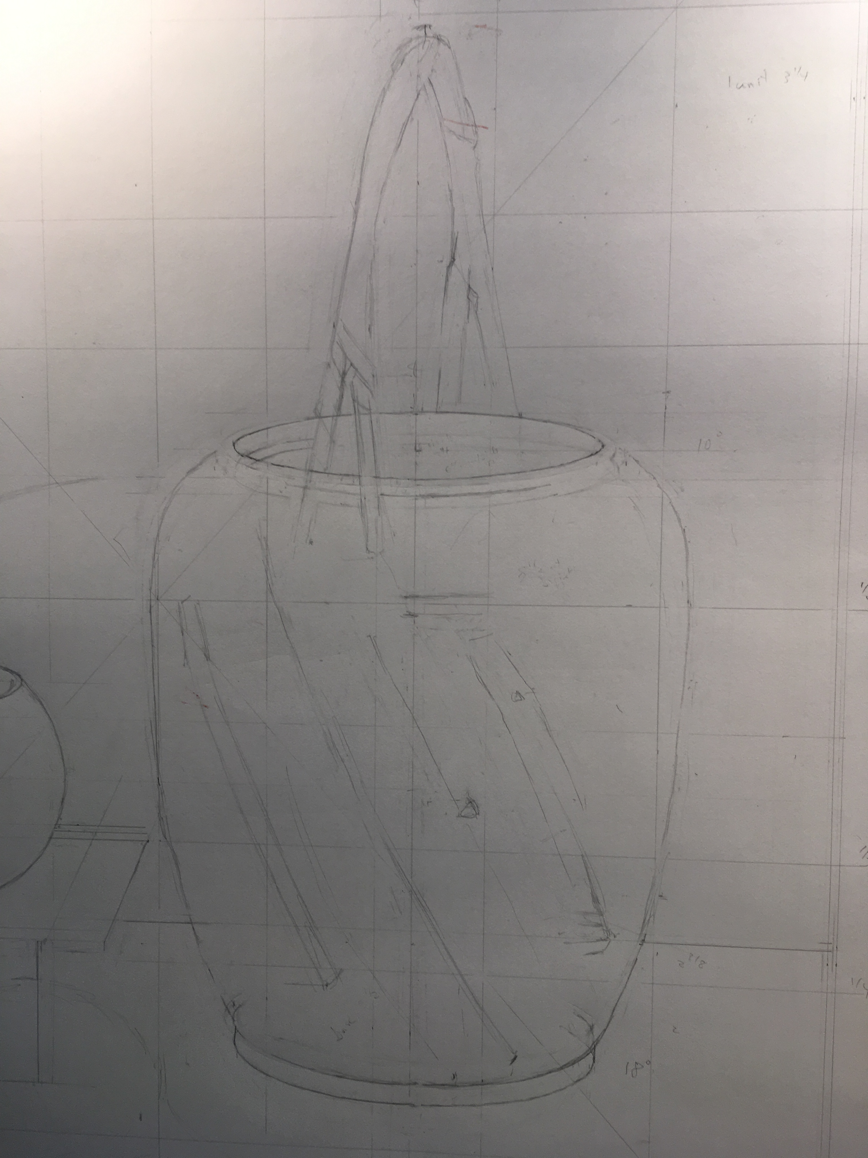 Above is my first shot at drawing the basket. After I finished it, I saw that the ellipse at the top was too wide, and the width of the basket was too wide for its height. I corrected those errors, then decided to calculate the correct ellipses for the top and bottom of the basket. I figured out the angles of the ellipses using string and a protractor (see https://lindamann.blog/2018/02/11/the-drawing/ for an explanation), then transferred them to my drawing using tracing paper rubbed on the back with pencil.
