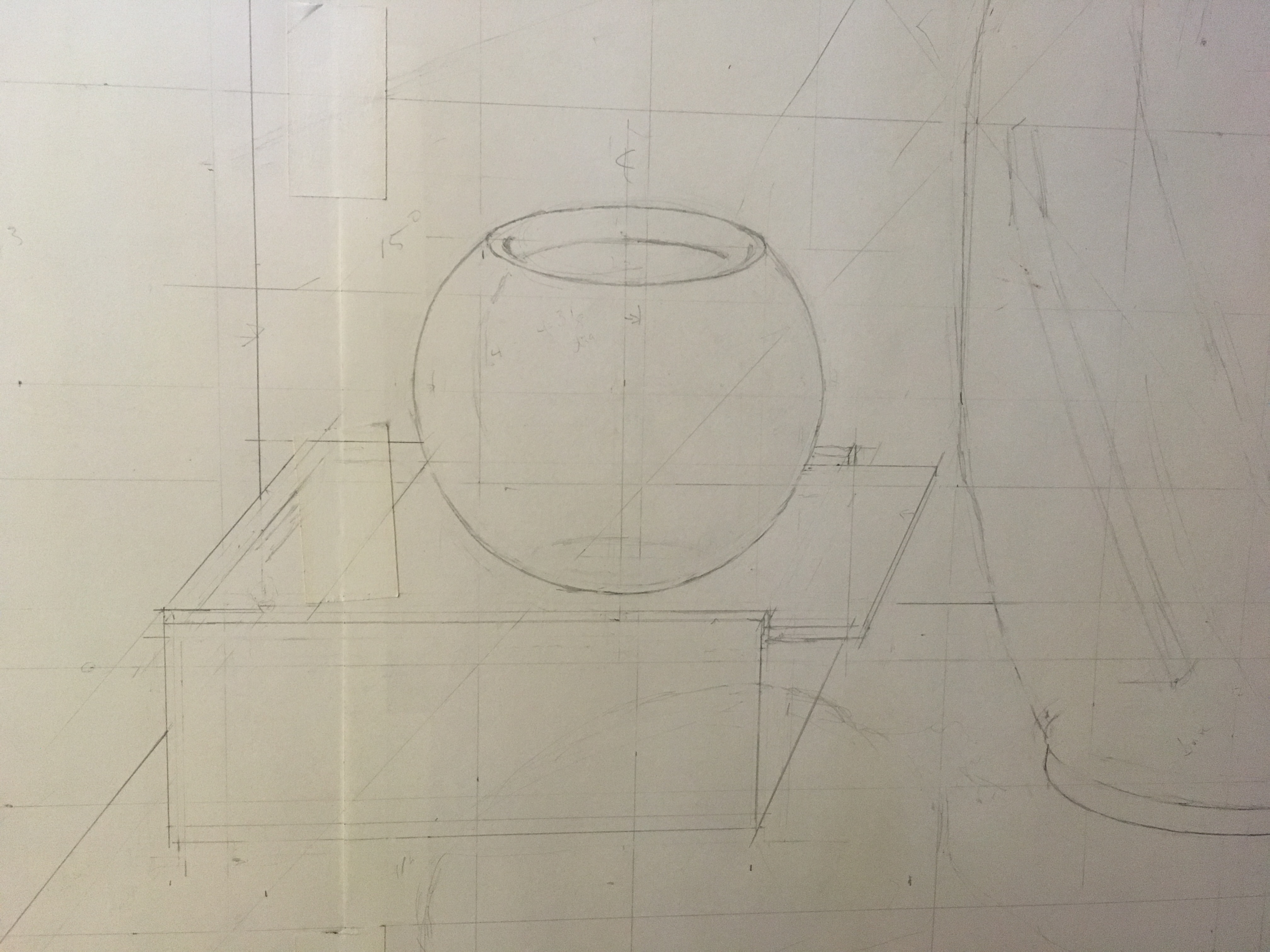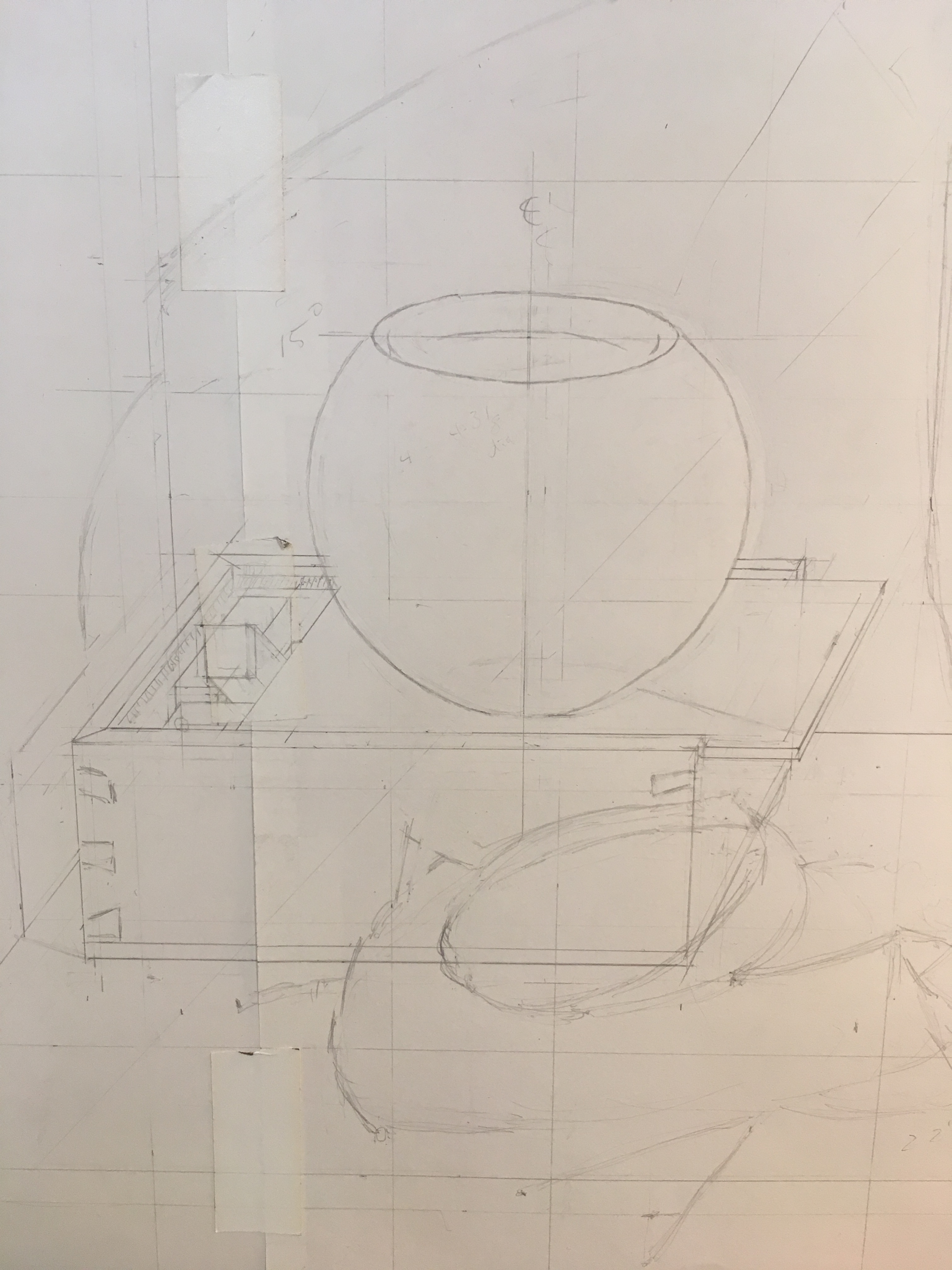 Now it was time to draw the box and then the bowl. Before I began, I had to figure out where my vanishing point was, so that I could draw the box in perspective. I could just copy the angles that I saw without finding the vanishing point, but if I have an actual vanishing point marked on my board, it’d be much easier to just draw the correct lines converging on it with a ruler than to rely on my eyes. The vanishing point is wherever my eye is. It’s not hard to figure out the correct height (my eye level when sitting on my chair), but it’s hard to pinpoint the correct position on the horizontal plane, especially since we have binocular vision and a dominant eye.