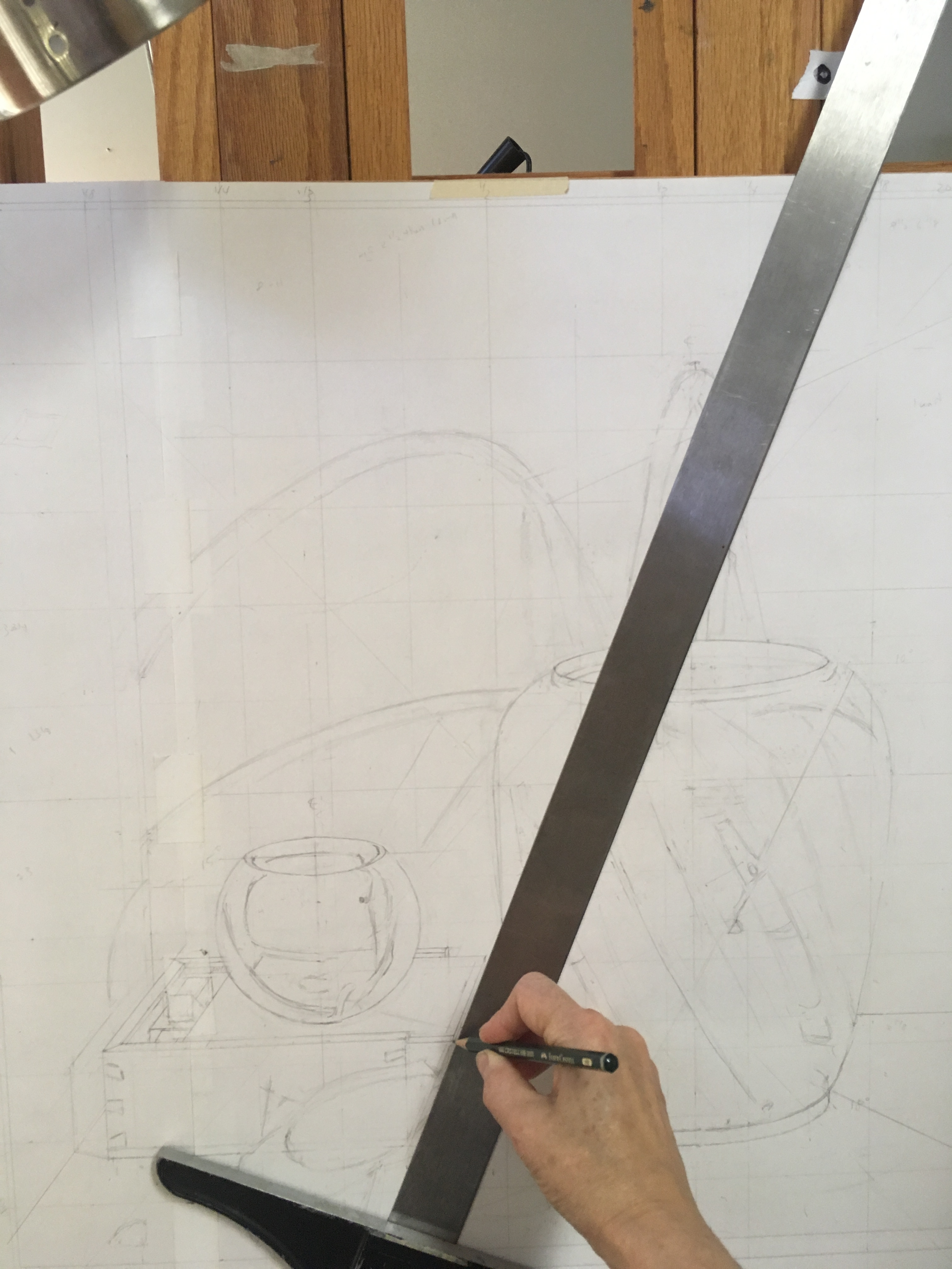 I’ve found the easiest way is to hold up two rulers in front of me, each lining up with a receding line in the composition and see where they meet. This is the vanishing point! I note this spot on the wall with a piece of tape. You can see it in the above photo over the top of the rice paper. You can see that all of the lines in the composition that are perpendicular to the front plane would meet at this point if continued upward. (The photo has some distortions due to parallax, so this effect can only be seen for the lines at the bottom of the composition.) I then locate the equivalent spot on my paper. Often, it is above my paper, so I mark it with a piece of tape on my easel. Now, drawing receding lines in correct perspective is easy, as they all should converge on this spot.