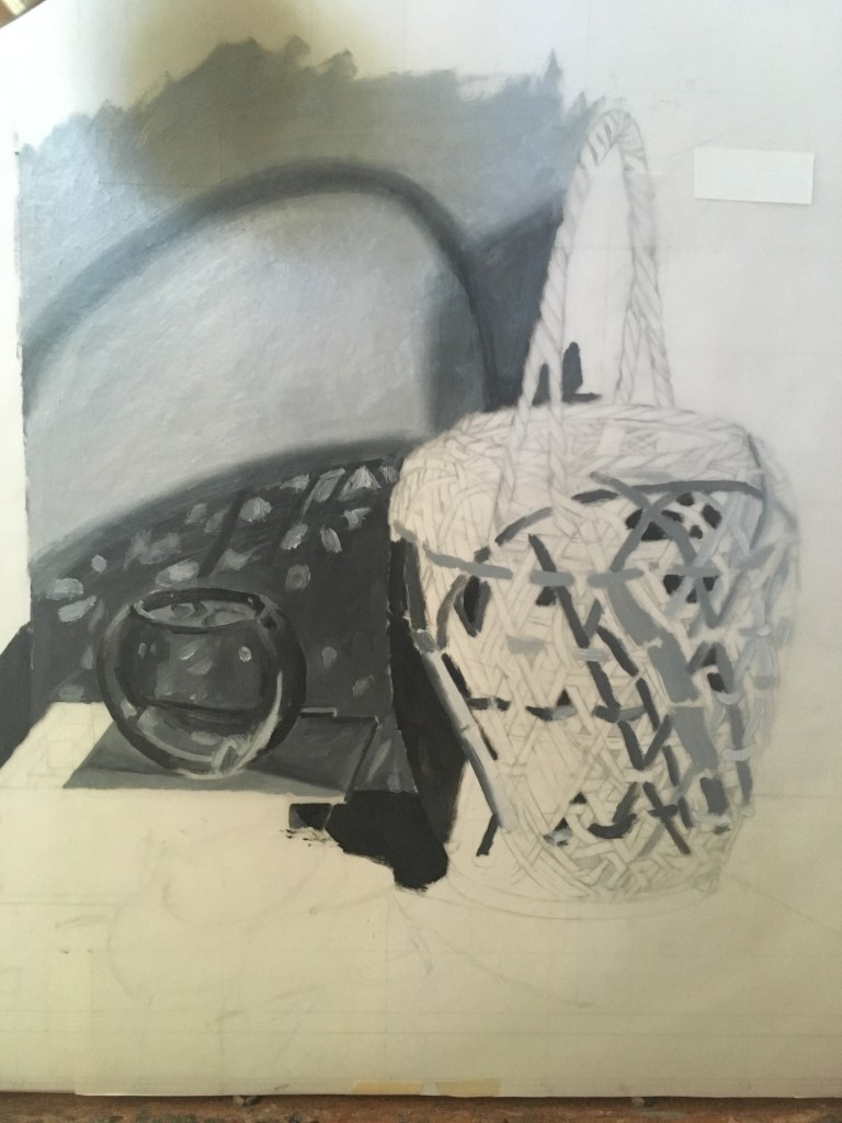 I didn’t intend to put so much detail on the basket at this point, but it almost seemed easier to follow the lines than to simplify it! I don’t think I’ll continue this way. I’ll be a lot more loose with it at my next session. When this study is complete, I’ll use it both to judge the composition, and to guide me when I’m painting on the canvas.