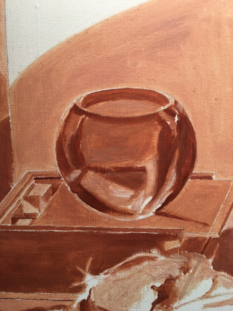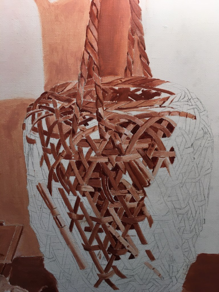 I’m continuing to work on the underpainting. Above, I’ve begun to tackle the handle. I wasn’t happy with the accuracy of my drawing of the weave on the handle. I ended up re-drawing it in paint, which is not as easy as with a pencil! It took a lot longer than I thought it would.