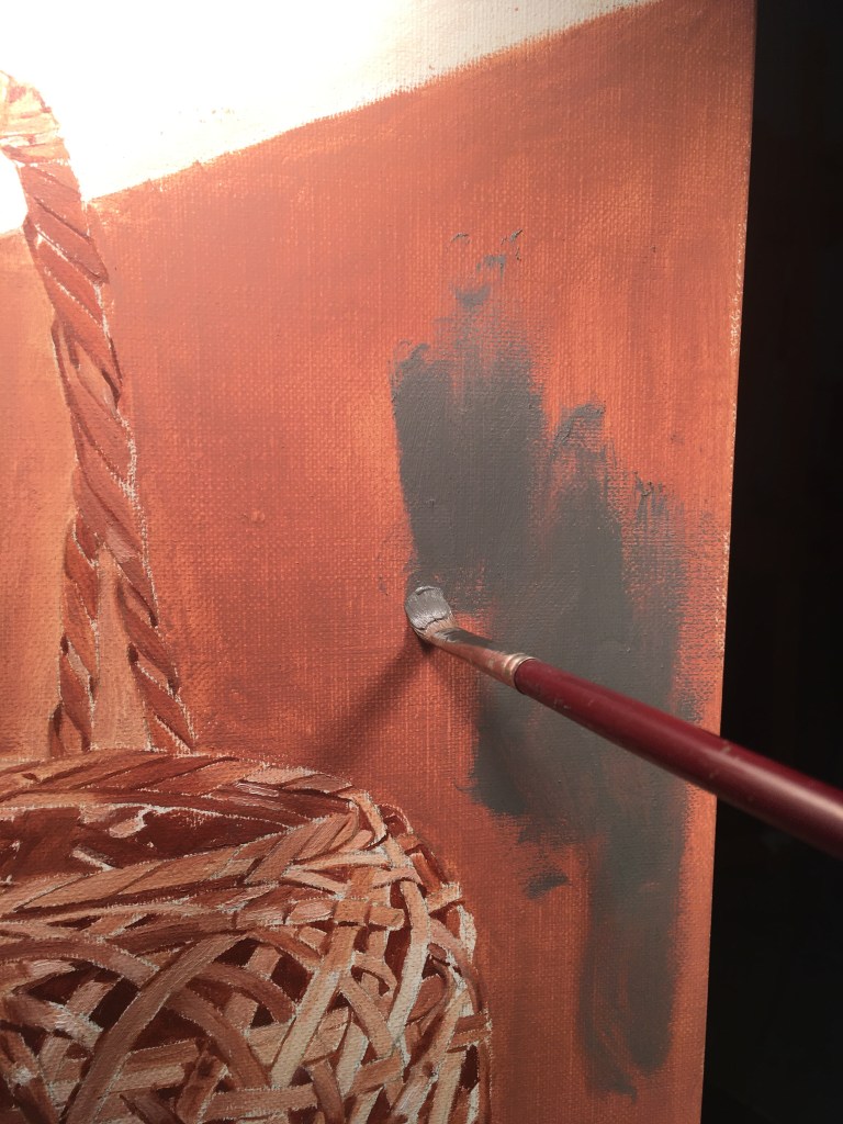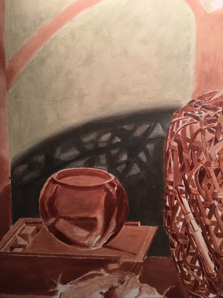 I painted the rest of the wall in shadow in the same color as the shadow of the basket. Some of the underpainting shows through this layer. I like that, as it will show through the final glazing a bit to add vibrancy to the shadow.