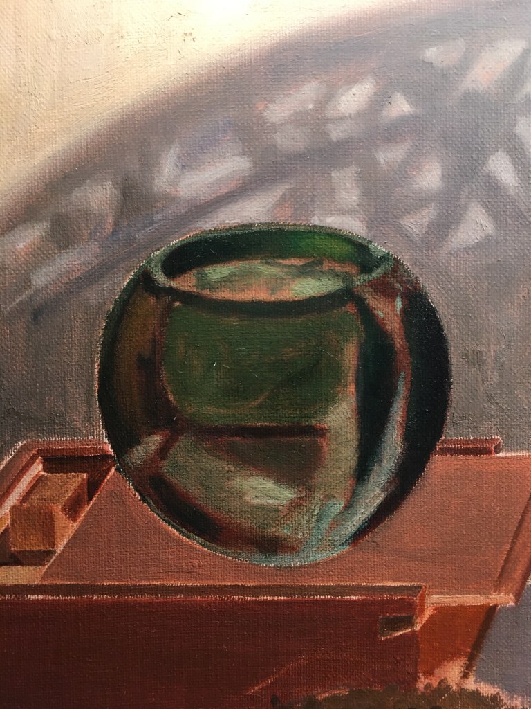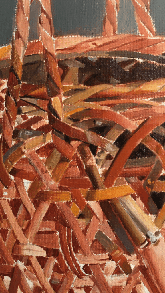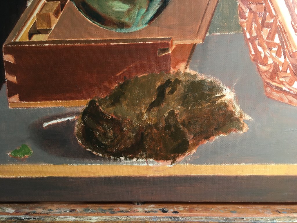 I started painting the basket. It’s so hard at this point to judge the correct colors! I just made my best guess, knowing that I’ll correct later. I decided not to paint the shadows in yet. I’ll use a dark glaze for those when this layer is dry. Unfortunately, leaving out the darks makes it even harder to judge the correct values for the other areas. So, it’s hard to judge both the colors and the values!
