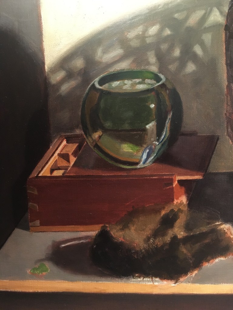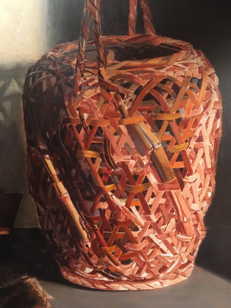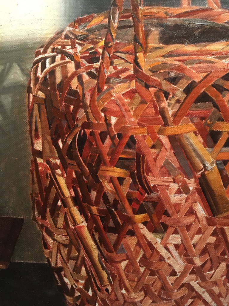 Above, I show the basket as it was when I began the session, and under that, how it looked when I finished. I glazed the left side of the basket, which is in shadow. I’ve been looking forward to doing this, as it’s easy, and instantly reinforces the feeling of 3 dimensions. I’ll add more glazes later, to darken it further, when I can better judge the correct value. I wiped a bit of the glaze off here and there where the light parts of the back wall show through the basket.