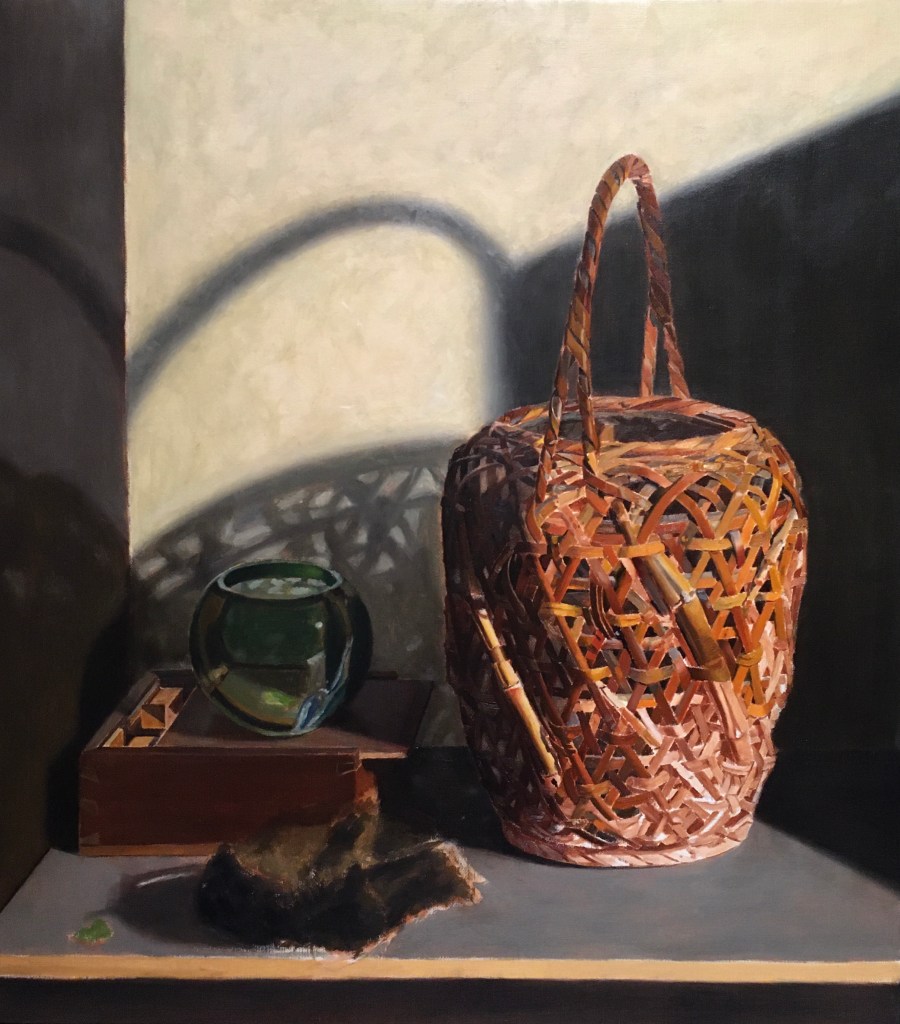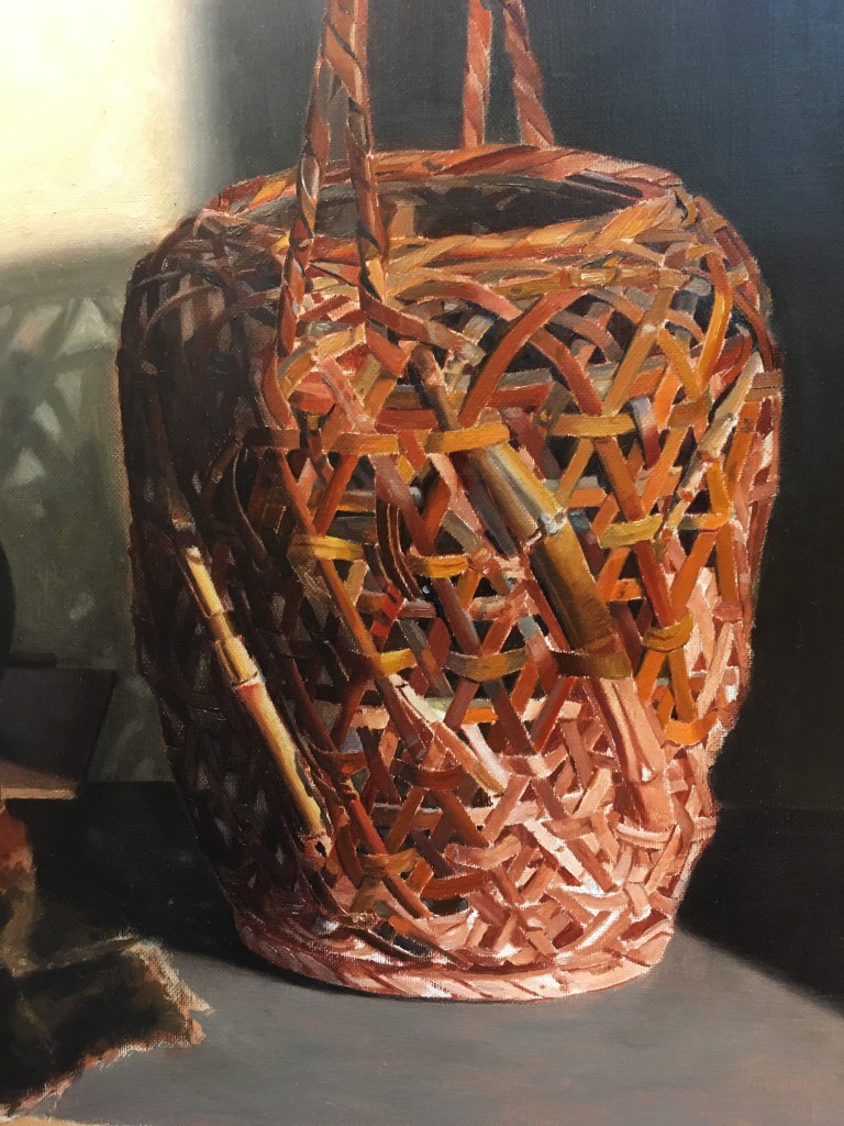 Next I applied myself to working on the basket, adding more strips. I’m not going for finish-level quality here. I’m just trying to get the basic local colors in as best I can. I’m not painting the larger shadows yet. These I’ll glaze in later after this layer is dry.