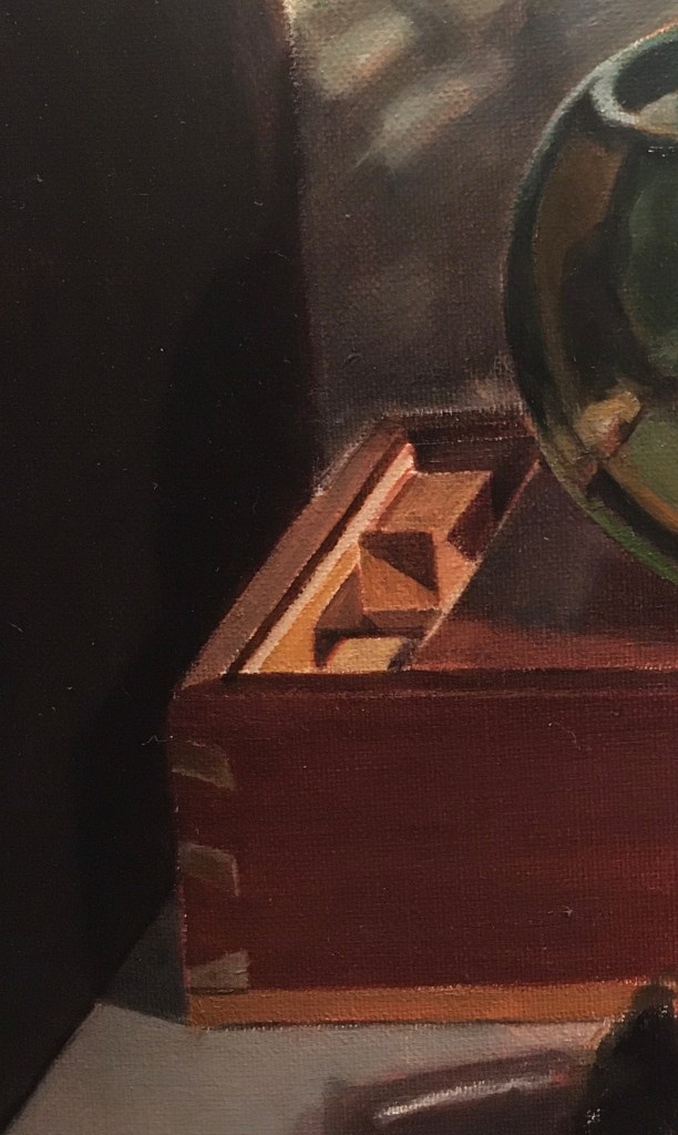 At this session it was time to scumble a light orange tone on top of the deeper brown of the wall on the left (actually a lacquered box propped up on its edge). A scumble is a semi-transparent layer of lighter paint dragged over a darker layer underneath so that the under layer shows through. You can see the result in the second photo. I preferred this approach to simply painting it in the correct color in one layer because the transparent nature of a scumble results in a surface with a beautiful pearly quality. This suggested the irregular and reflective nature of the box nicely. When scumbling, you have to remember that the area will look cooler (bluer) than the actual paint mixture that you apply. I had to mix quite a bright orange to achieve this result. Also, the paint has to be dragged over the canvas with a dry brush so that the pigment gets caught by the top surface of the weave of the canvas. I also scumbled a few spots of a lighter and cooler tone at the top to represent the reflections cast from the back wall.