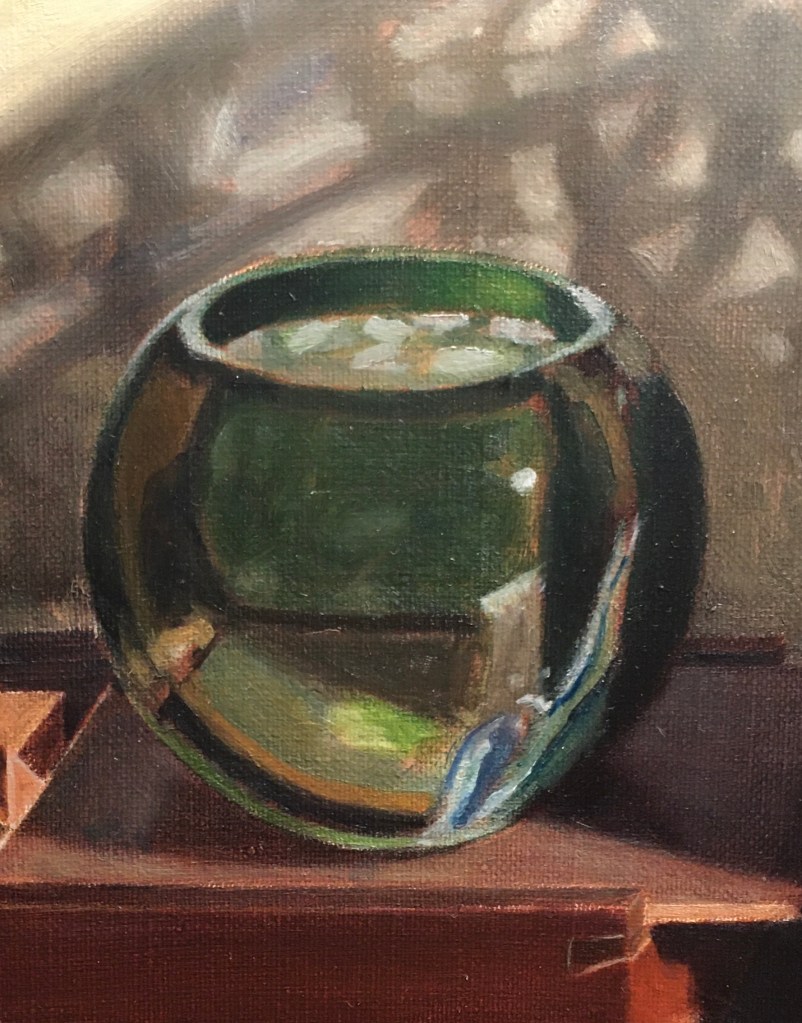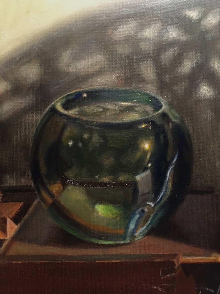The question that I am most often asked by people is how I paint glass. I know that it must seem confusing, but it’s just like painting anything else. I’m just painting the shapes that I see through the glass as well as the outline of the glass object itself. The shapes seen through the glass are modified by the shape of the glass object, so that they seem to curve around, following its shape. I suppose the trick is to look at the facts- the visual data- that you are seeing, not to think about the object as transparent. I use my eyes and not my brain, if you will. So, I would say to myself ‘there is a round shape there that is pale green, that touches a dark vertical piece,’ instead of wondering what every little shape actually is. It can be confusing at first to see all of the shapes, because things seem distorted when they are seen through glass, and there can be many reflections. The trick is to just put down what you can understand, and gradually, at each session, you’ll be able to see more.