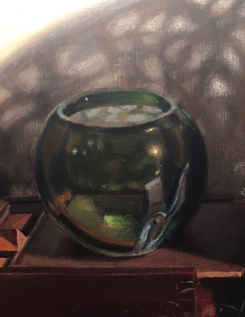 I noticed that the top rim of the box seen through the bowl was placed too high. I lowered it. I corrected some shapes and colors near the rim. I did some work on the box top showing some green reflection cast onto it by the bowl.
