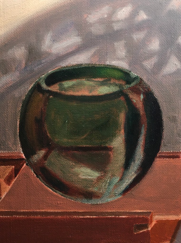 Above, I’ve filled in some details, painting the blue design on the right side, some highlights on the top rim, and some bright green at the top and in the reflection in the base.