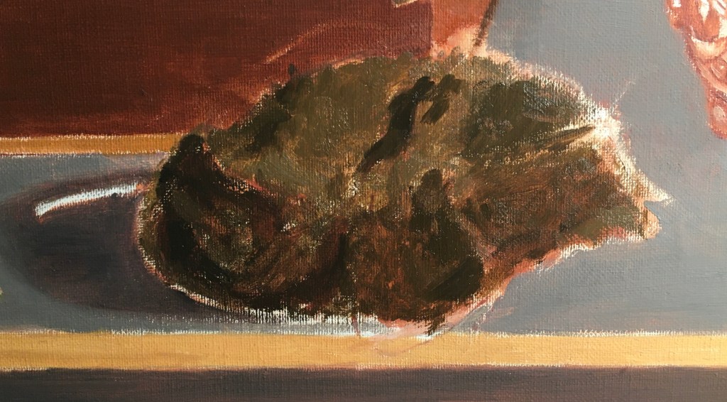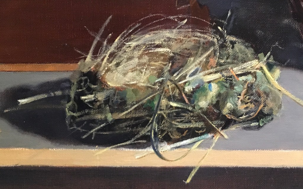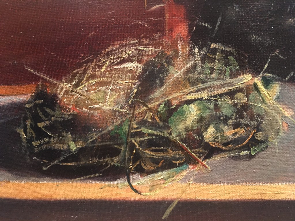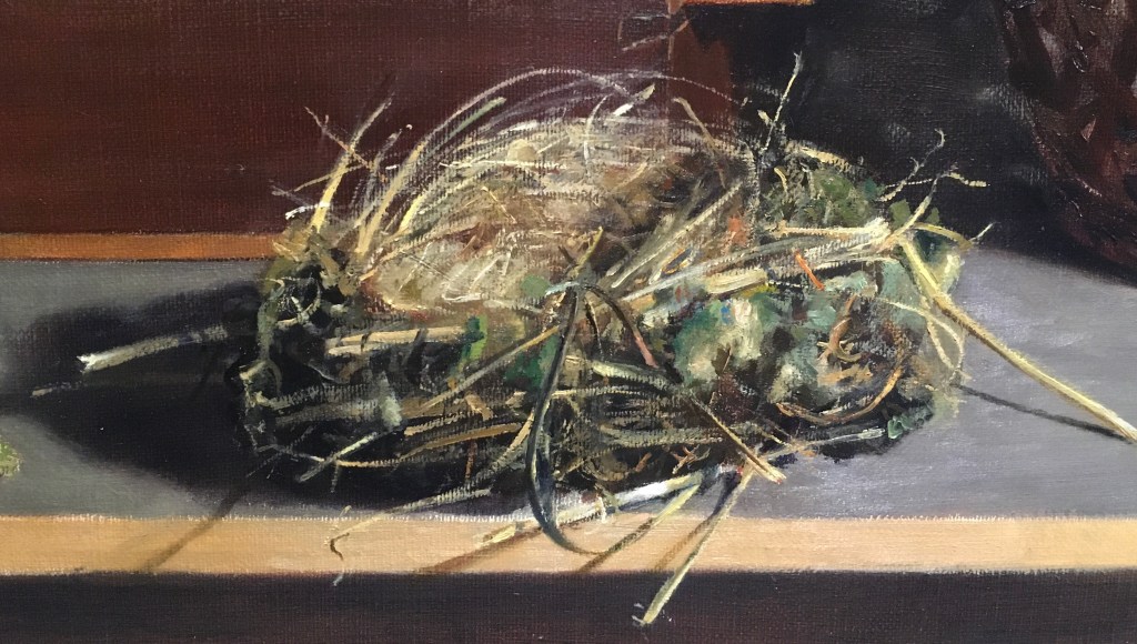 Above is how the nest stands now. I’ve filled in the interior with lighter strands and have begun to add the lightest pieces all over. I glazed the shadows cast by the grass onto the table and over its front edge. I’ve begun to paint in the tiny bits with a very fine brush. I still have more highlights to add and some more details, but it’s largely there now!