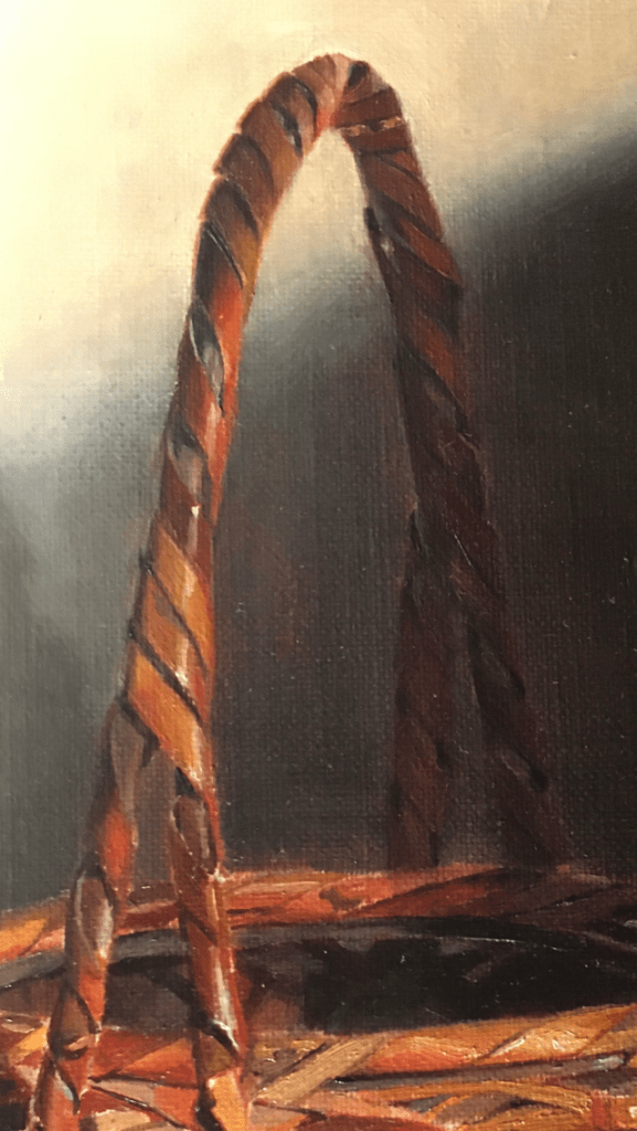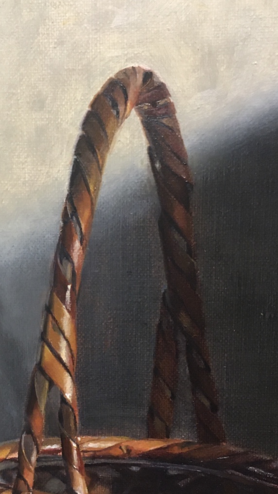 I was comparing my painting to my initial photo of the set-up and I noticed that the handle was drawn incorrectly. The top portion was too narrow and some of the angles were wrong. It amazes me that something could be so off at this late stage without my noticing it! I suppose that I get so focused on the details that I lost sight of the ‘big picture!’ I might have left it the way it was, but I really preferred its true form. One of the great things about oil painting is that it is rarely too late to fix something. Below you can see my corrections.