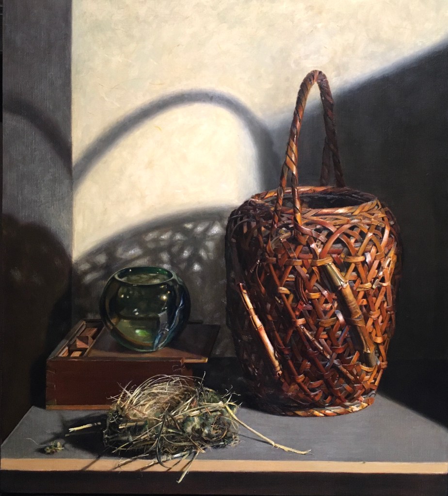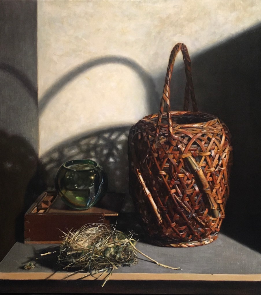 After my last session, I lived with the painting for a few days and decided that it needed to be darker between the basket and the bowl, and on the far right. Even though I had captured the actual quality of the light there, I thought that the composition would benefit from more drama and contrast. I decided to add a dark glaze in these areas. I only applied a thin glaze, so I could judge its effect and then add another if I thought it necessary. Also, the table top seemed still to be too dark. I scumbled a light gray over the right-hand side, nearer the light source. I added more light touches to the bowl and box. I shortened the piece of straw sticking out to the left. I had lengthened it a few sessions back, but it had been bugging me since. I scraped off the thick white paint with my palette knife, then dotted in some dark glaze to cover. If I had just glazed over it, the impasto (thick paint) of the straw would have shown through. Finally, it’s been bothering me how yellow the rice paper has been looking. I decided that it needed to be cooler (it was cooler in reality, as well). I scumbled pure lead white over the entire background wall. This added a bit of texture, as well as neutralizing the yellow. After it dries, I’ll repaint the tiny bits of golden fibers embedded in the rice paper, along with the tiny bits of light they reflected and shadows that they cast. These were obscured by the white glaze.