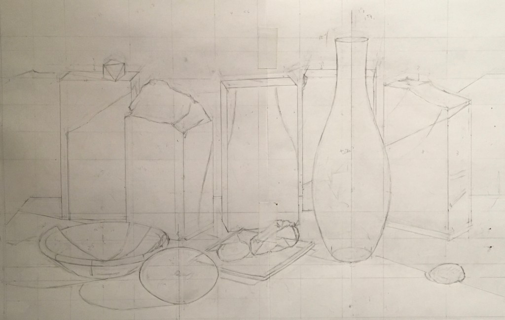 You can see that less of the top surfaces of objects are visible because I lowered my stool. The ellipse at the top of the black vase is shallower, as is the ellipse at the top of the basket. This all took quite a bit of re-measuring. I recalculated the height of my horizon line (my eye-level) and marked it with a long strip of tape at the top of my drawing board. I drew a dot on the tape at my vanishing point (the spot directly in front of my eyes) I made sure that all lines perpendicular to the picture plane (such as the tabletop and far left brick) met at the vanishing point. This is called one-point perspective. Most of the bricks aren’t parallel to the picture plane, so each has its own two vanishing points on the horizon line-one for each plane. This is called two-point perspective. If the angle is sharp enough, I can draw the vanishing point on my horizon line and use a ruler to draw a line at the correct angle on my brick. The vanishing point for the front plane of each brick that is close to being parallel to the picture plane would be far off to the side on the horizon line. I just estimated these angles because its not practical to draw such a long line.