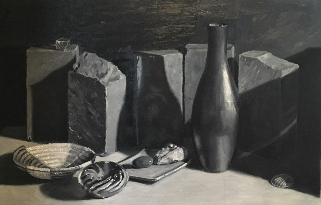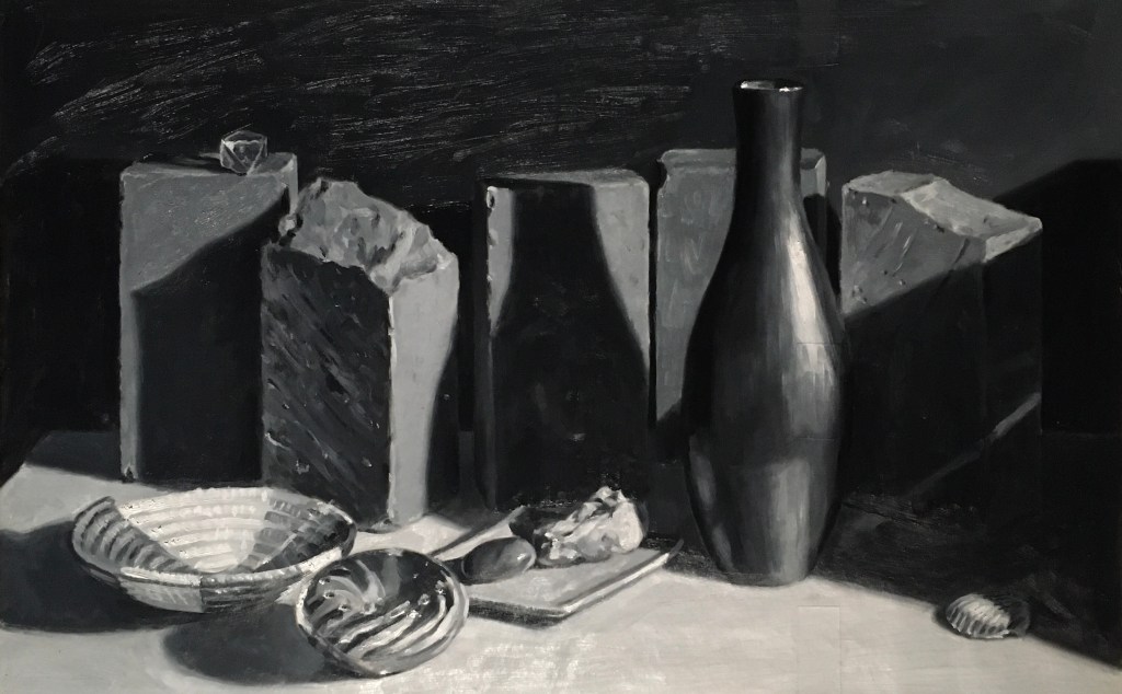 Above is the value study as I left it last. I find that my eye is drawn to the shadow cast by the black vase onto the center brick. I don’t like this. I thought I’d try to move the shadow over to the left, so that only a sliver of light is left on its left side.