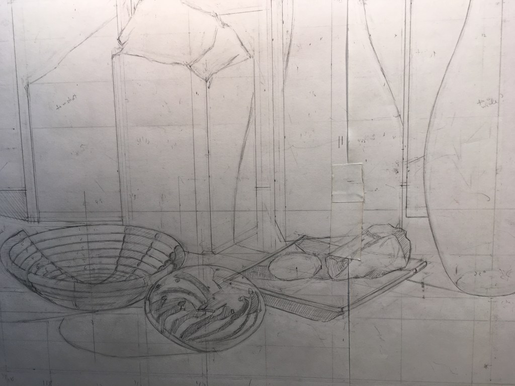 Above, I taped some tracing paper over my drawing. I’ll now trace the drawing so that I can transfer it to my canvas.