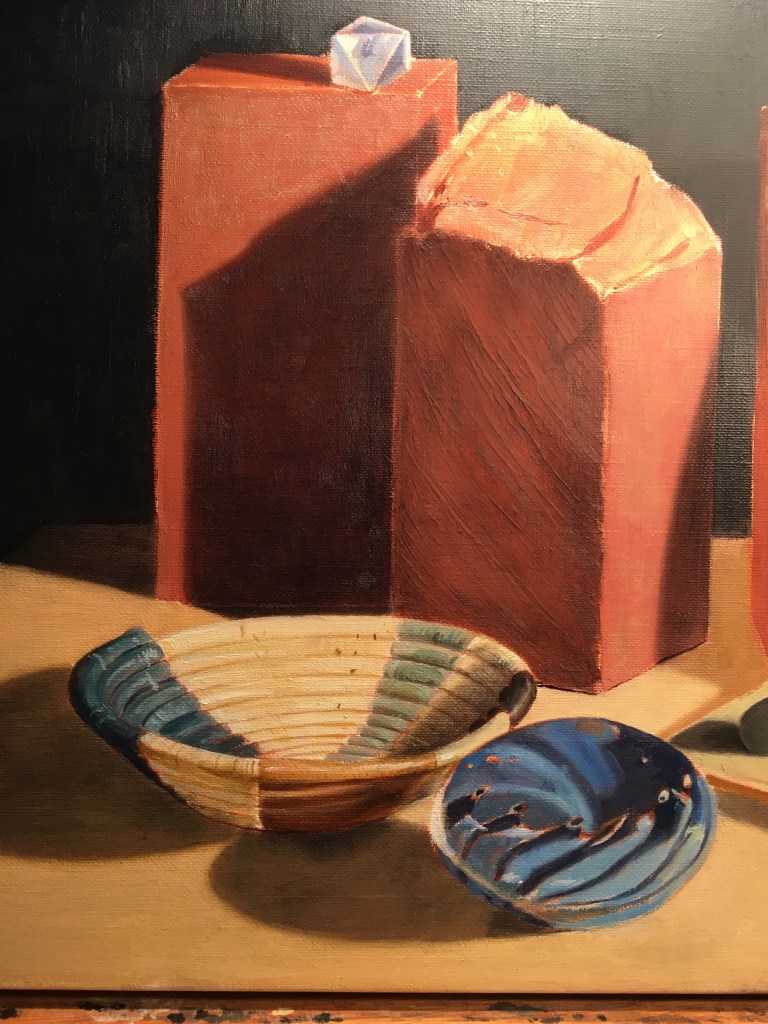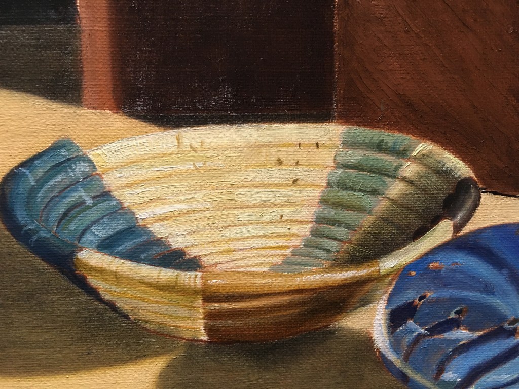 Next I refined the basket. I darkened the blue area on the left with a glaze of phthalo blue and a bit of burnt sienna to dull it down a bit. I then painted in the darks and picked out some highlights. I repainted the light area, also putting in some darks and lights. I began to indicated the markings on the weave. I muted the lines separating each layer of the coil. I then darkened the outside of the basket with a warm glaze of transparent golden ochre and a bit of cobalt blue. Finally, I put another layer of glaze on the shadow on the inside on the right.