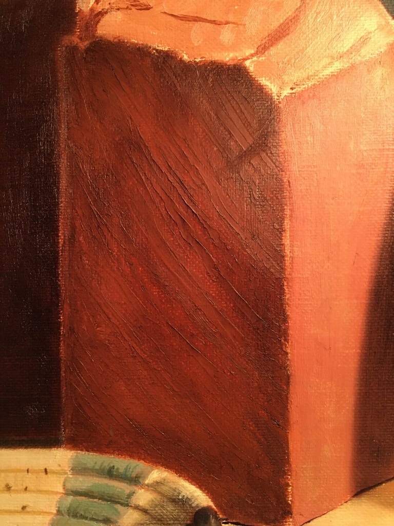 I scumbled some light paint over the lit areas of the bricks. I finished putting the local colors down on the left side of the paperweight. I’ll pause here. The rest of the painting should be dry in a few days. I’ll have to wait to continue with my glazing!