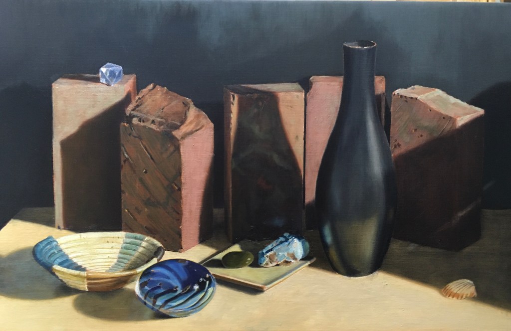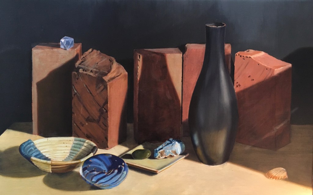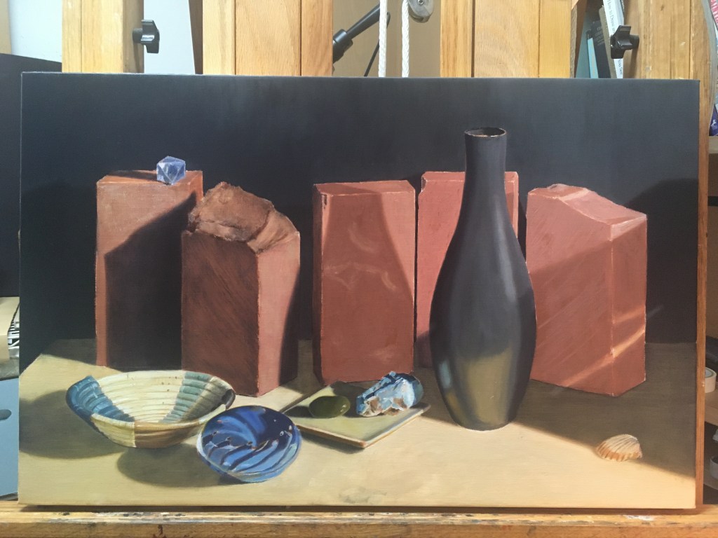 Above, I’ve glazed the rest of the bricks and the shadow on the right tabletop. On the lighter areas of the middle brick, I’ve scumbled a lighter, greener tone both to show the texture and to neutralize the bright orange, bringing it closer to the right color and value. I added a thin glaze of a greenish color to the forth brick to darken and neutralize it.