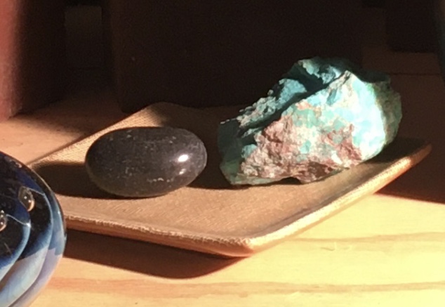 As the surrounding areas developed, I could better see the colors and values on the stones and dish. I lightened the dish and glazed all of the shadows darker. I added bright blues to the turquoise and lightened the right side of the green stone.