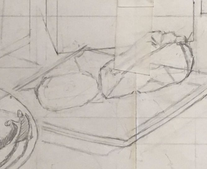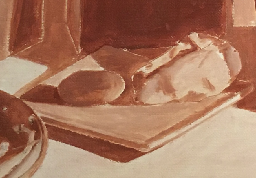 After the drawing was transferred to the canvas, the next step was to paint the under-painting in various tones of burnt sienna and lead white. I have omitted details and painted everything much lighter than it’d be in the finished work.