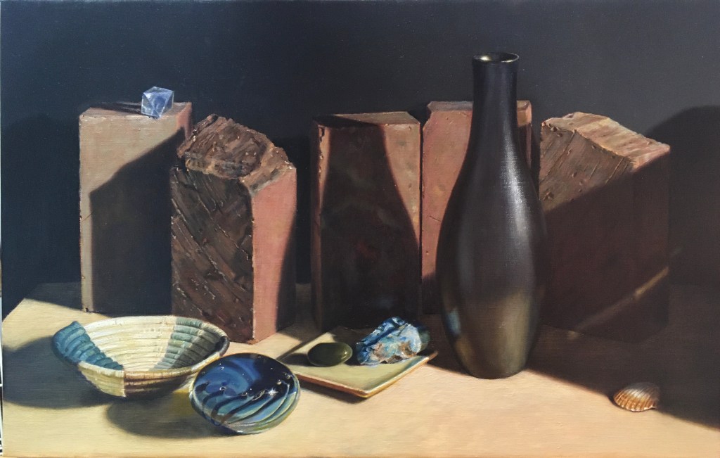 The biggest change was that I altered the shape of the turquoise where the long ridge casts a shadow. I was able to make the change pretty easily since I wasn’t changing anything major. A major change would have been hard for me to invent in a convincing way. The altered shape looks much more pleasing to my eye. I then added many details, highlights and shadows, always trying to observe carefully. Much of this was very hard to see before, but now seemed comprehensible. I put in some reflected lights from the turquoise down onto the dish. Last, I glazed pure phthalo blue in a few areas. I worked on the stone a little bit, softening edges, refining the reflected light from the turquoise, and adding a few streaks. I brightened the top left side of the dish, and added a highlight at the front edge. I repainted the right side, muting the blue reflection, and brightening the rim.