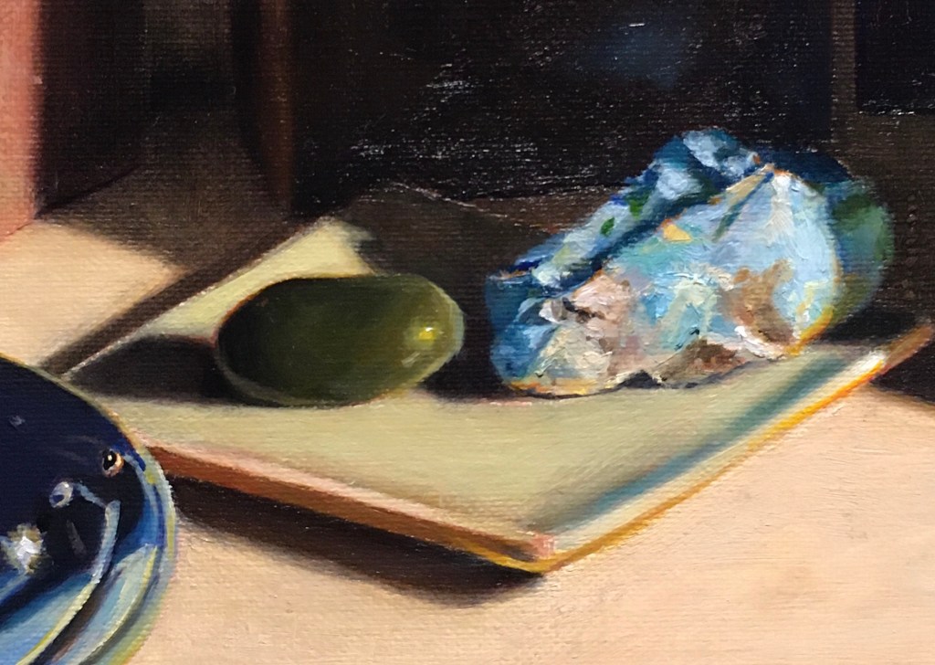 The painting is mostly complete. Values, colors and shapes are pretty accurate. Now I can spend some time carefully observing and recording subtle details such as reflected lights, exact colors, edge quality, and comparative values. I couldn’t work on these things earlier, because all areas weren’t complete and available for comparison (essential for painting accurately), and also there was no point addressing small details if the larger objects weren’t correct first.