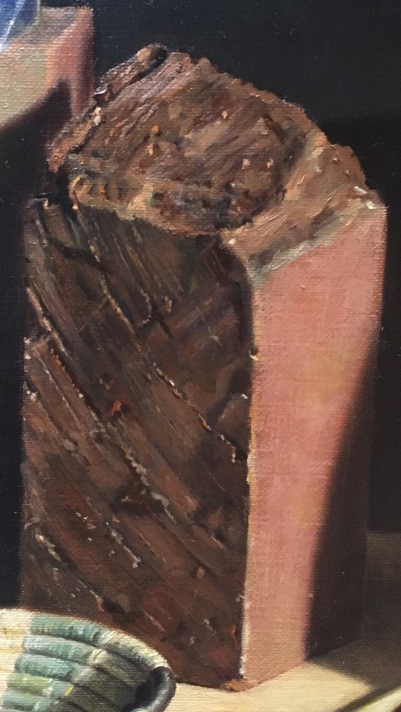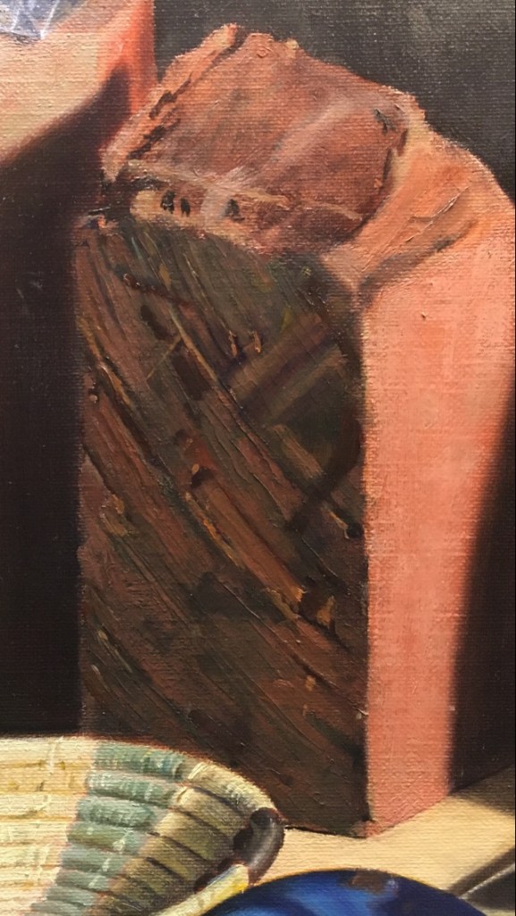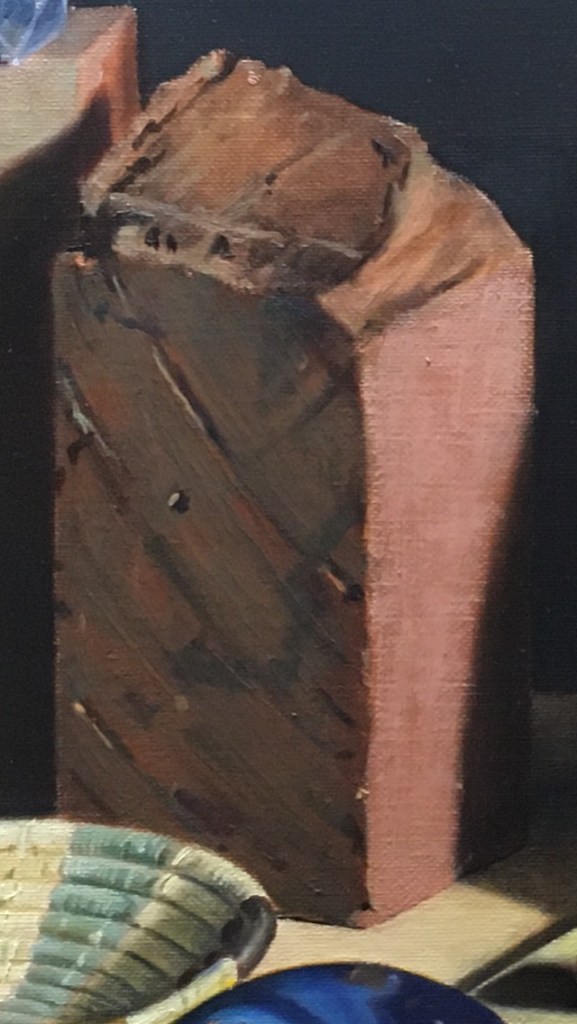 Now that a lot of details were in place, it was easier to observe more of them. I thought that maybe the whole brick was too light, so I glazed it all a bit darker. I also began adding highlights and more details to the top of the brick. Rather than paint every ridge, I tried to suggest a few of them.