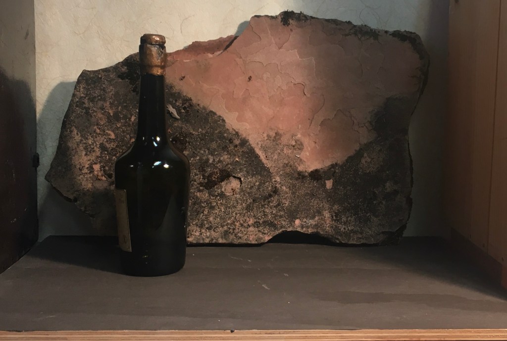 I liked the way it looked with the rice paper behind it, so I left that up. Also, the colors were harmonious with the brown board I had used as the tabletop, so that stayed too. Glass would be a nice contrast with the rough stone, so I selected a green bottle, whose color also complemented the stone. Two objects do not a still life make, though!