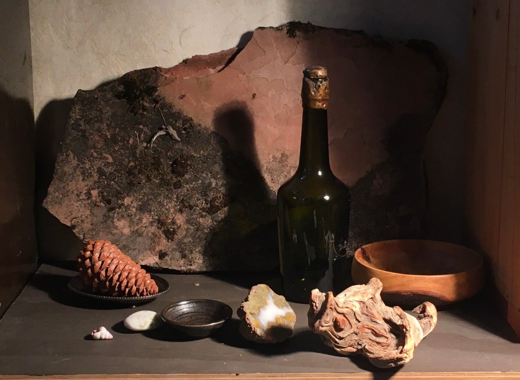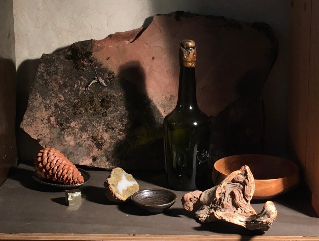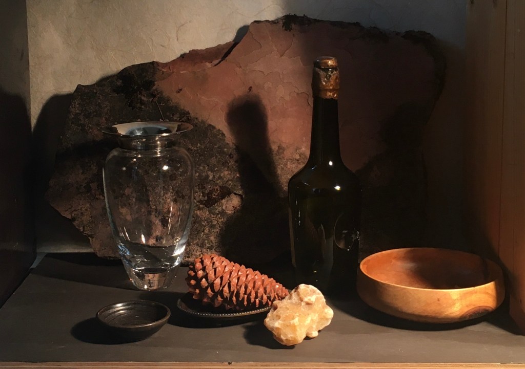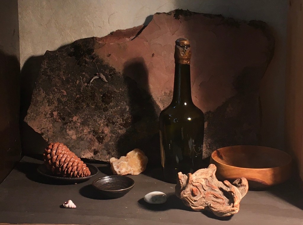 I moved the dish with the pinecone to the left and added the driftwood for some more textural interest. The whole set-up was looking very dark. It’s usually a good idea to have a full range of values from white to black in a composition, so I put in the white stone and shell.