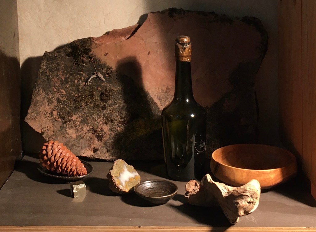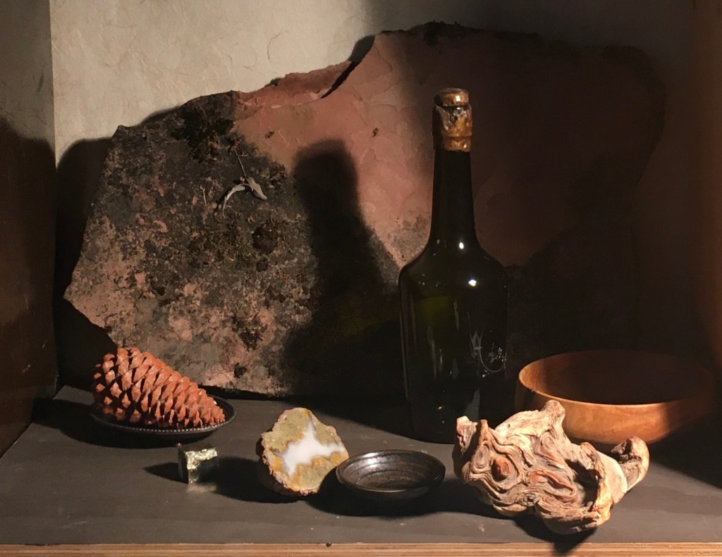 The curve drew too much attention away from the top of the composition, so I re-arranged the objects in front in more of an upward curve. I substituted some fool’s gold for the white stone. I didn’t like that the geode was almost dead center. That can be very distracting in a composition. I switched it with the brown dish. I prefer this.