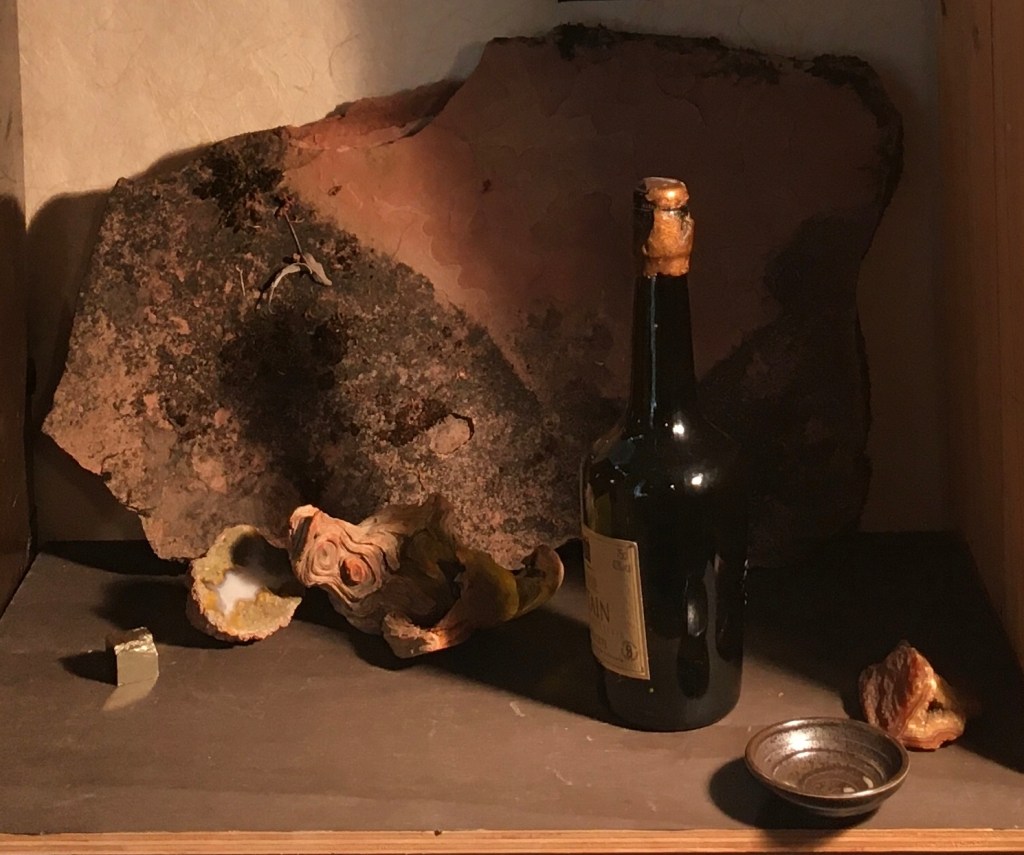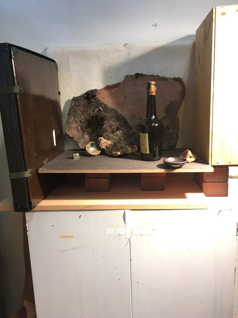 The second view is from a much higher vantage point- from my actual eye level, actually. It turns out that when I took the first photo, I held my camera at chest height to eliminate keystoning (which happens when the sides of a photo angle in due to parallax). This, of course, lowered the vantage point. When I returned to start my drawing, and looked at it from my usual eye level, everything looked wrong! I was viewing the set-up from too high. I could, of course, paint it this way, but I much prefer the look of a lower horizon line. I don’t like the viewer to feel as if they’re above the table looking down. I remember now that I had a similar problem with my bricks painting. I had to lower the horizon line and redraw everything from a lower level.