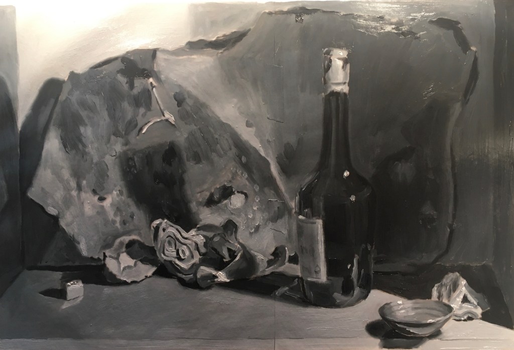 Above is the result of my first session. I’ll let this dry for a few days. If I tried to continue now, the different values of paint would smear together, and it’d be hard to achieve crisp lights and darks. Also, my first guess at the correct values is usually wrong. I need to see some paint covering the whole study, so that I can compare adjacent areas. Painting is all about comparing!