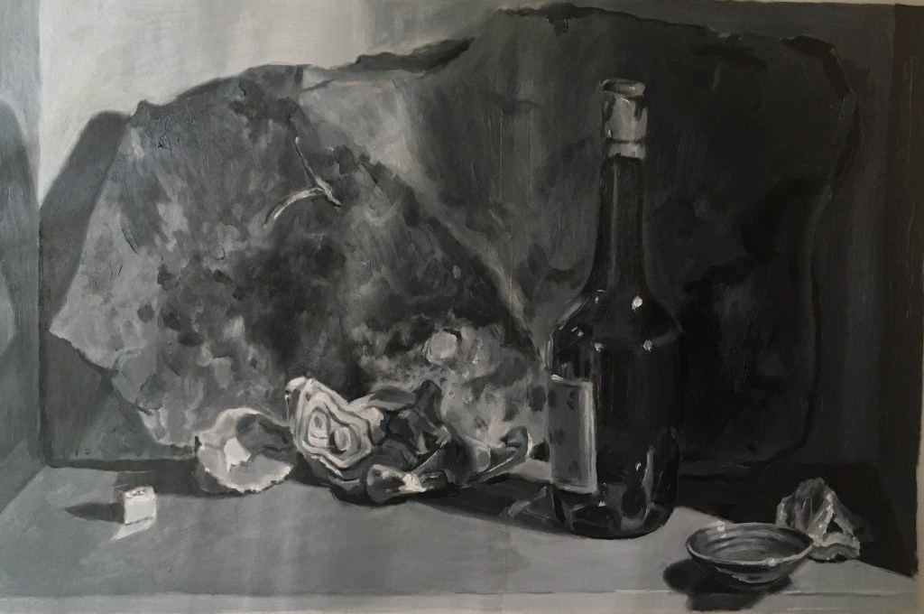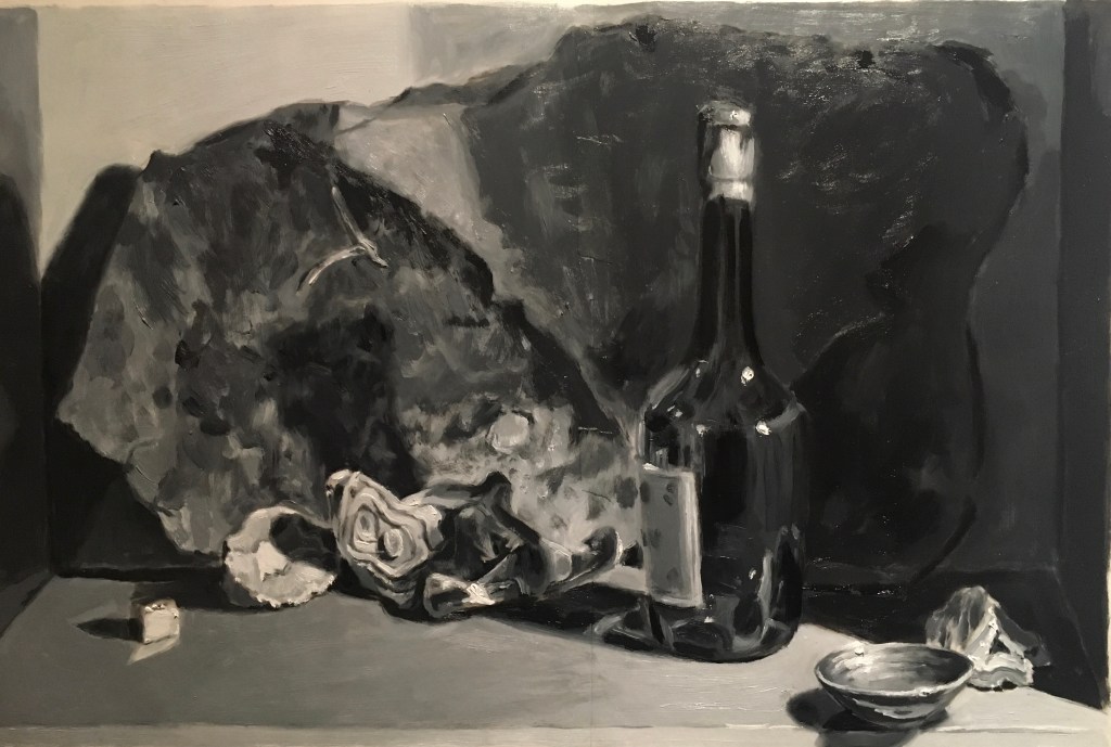 My value study looked a bit bland to me today, so I decided to compare it to the photo I took of the set-up. I immediately noticed that there were more dramatic darks in the photo. I think that I composed the set-up and photographed it on a cloudy day, but painted the study on a sunny day. Being me, when painting the study, I had to paint all of the light that I saw in the set-up. At the time, I suspected that the darks weren’t dark enough. However, it’s much easier for me to begin with what I see. It’s not too hard to adjust later when all of the values are in.