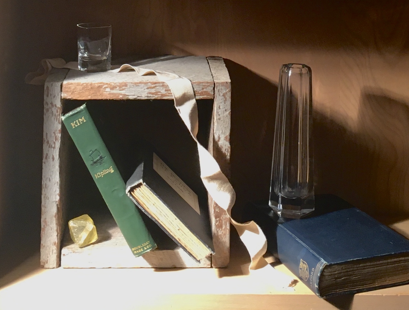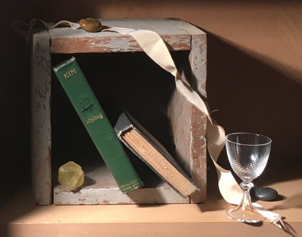 I changed to a more square view-finder, which placed the vertical much further over to the right and eliminated the blue book and vase. I immediately loved this. The ribbon leads the eye through the composition. The crate is an important part of the whole, not just one half. The angles of the books and ribbon add drama and dynamism. I was worried that the ribbon would lead the eye straight out of the bottom right of the picture, so I added the blue stone to turn the eye back up. I replaced the shot glass on top of the crate with a stone. The glass was too big and shiny and was drawing attention away from the more important objects. I also didn’t like the strongly lit left side of the crate. Fortunately, the cupboard where I set this up has a door on the left. When I opened this door a bit, it cast a shadow on the vertical, darkening it. Also, by eliminating the right side of the composition, I’ll now have a small painting- just what I wanted. I might prefer the yellow crystal turned the way it was in the previous photo. I’ll experiment with it a bit more before I start the drawing.