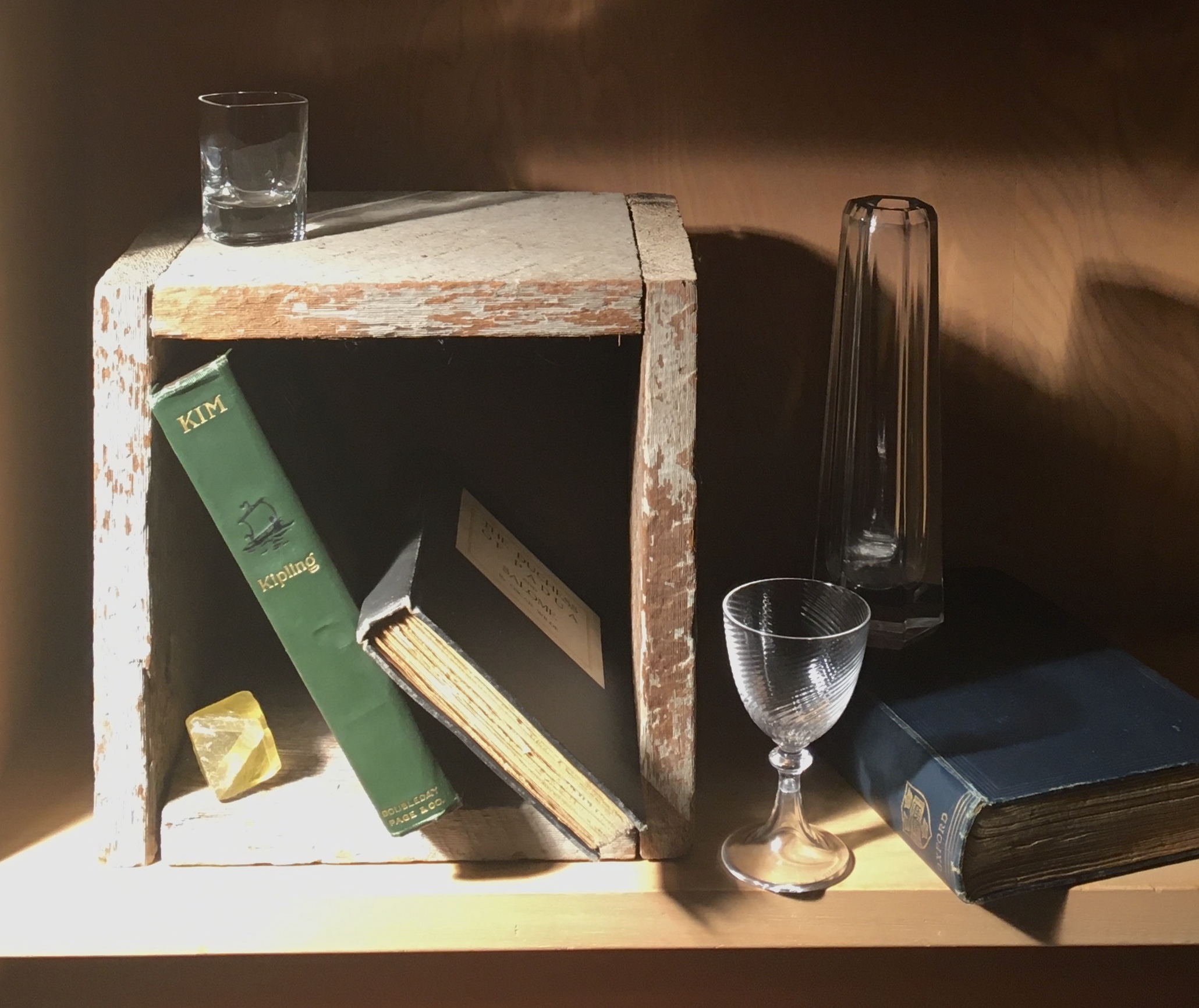 While waiting for the canvas to arrive for my sandstone painting, I decided to set up another still life. I thought I’d do a smaller one that wouldn’t take as long to finish as my big works. I love painting books and glass, so looked through my cupboards and shelves and picked out some promising specimens.