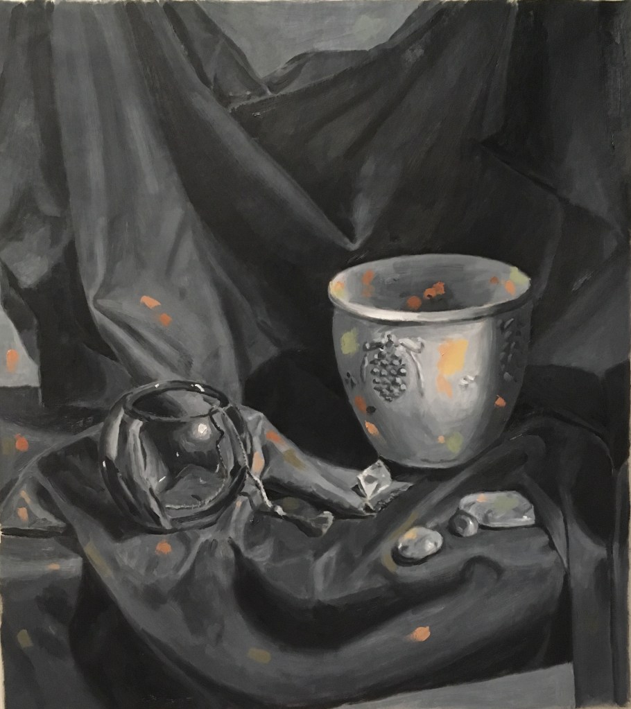 Before beginning my painting, I like to paint a value study in black -and-white. Seeing the composition without the distraction of color helps me to judge it. I’ve found that getting the value relationships right makes a strong composition. I also use the study to refer to later while painting. To judge if a color I mix is the correct value, I can dab a bit of the paint right onto the study. If it’s the correct value, it’ll blend right in. If it’s too dark or too light, it jumps out! Below is a value study from an older painting. You can see the dabs of paint I was trying to judge.