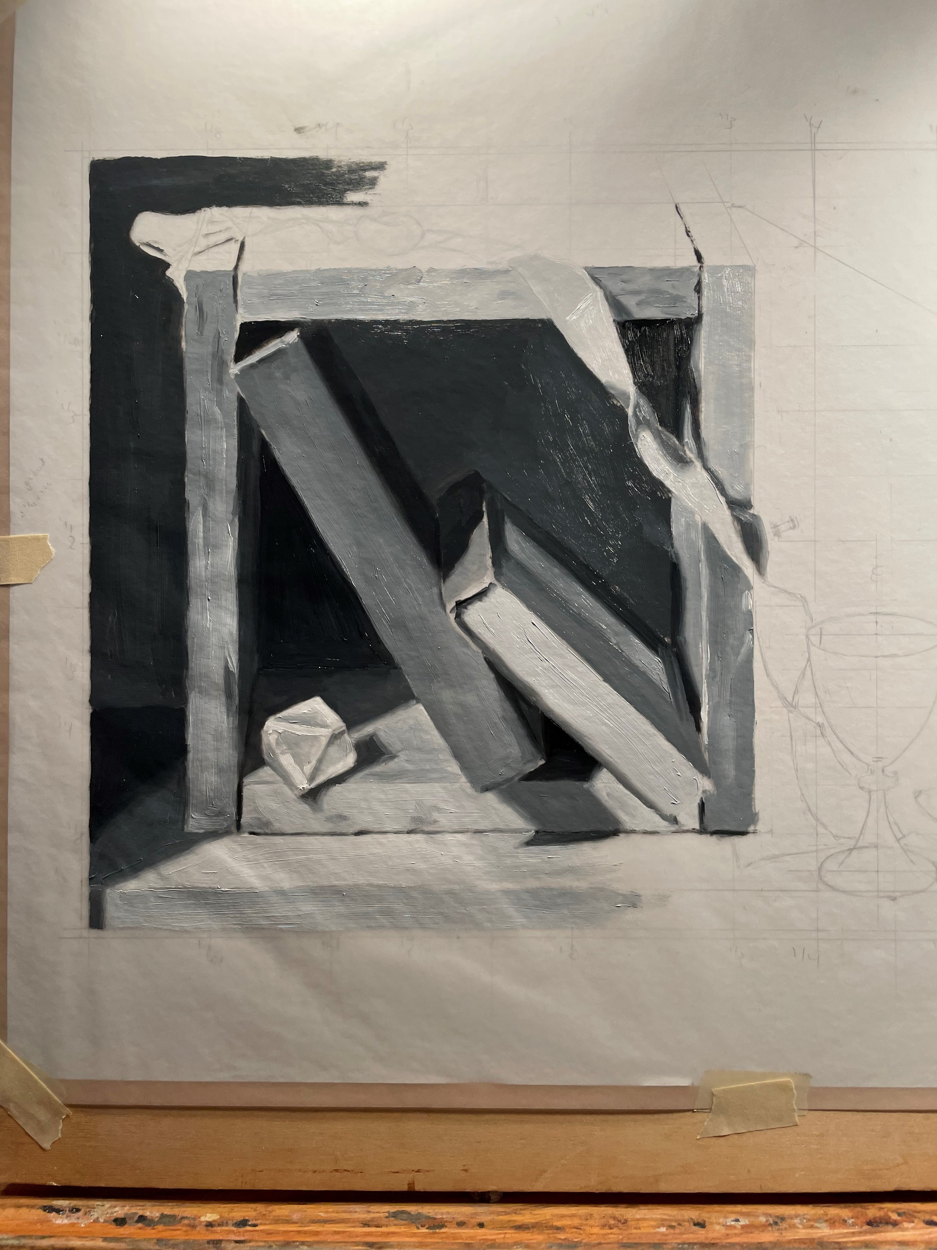 Above is the study after I worked on it a second time. It’s mostly correct. Now I’ll live with it for a while to see if I think the composition works in black-and-white. If so, I’ll go back and refine my drawing before transferring it to the canvas and begin painting!