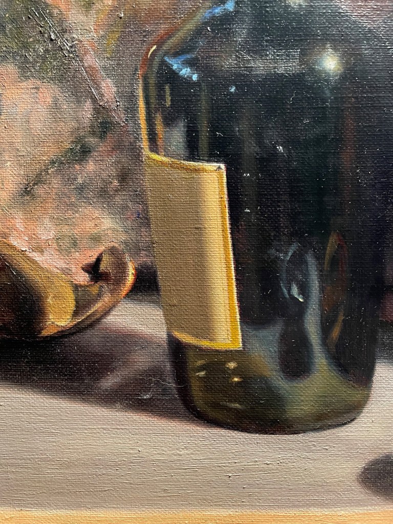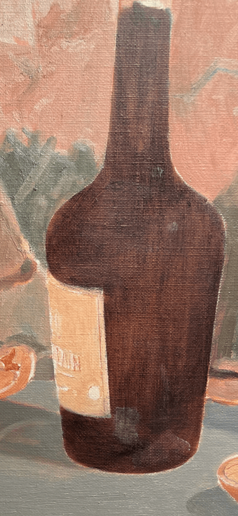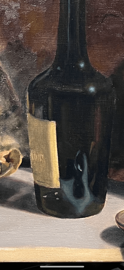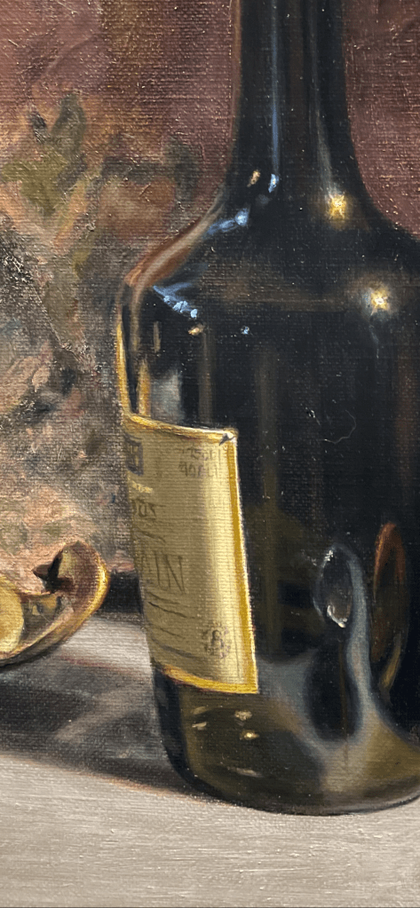 The painting of the label began with the barest suggestion of its color, while I tried to retain the position of the lettering from the drawing.