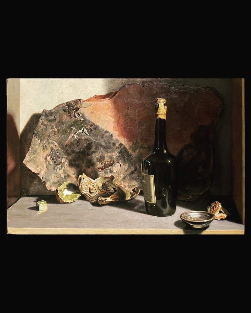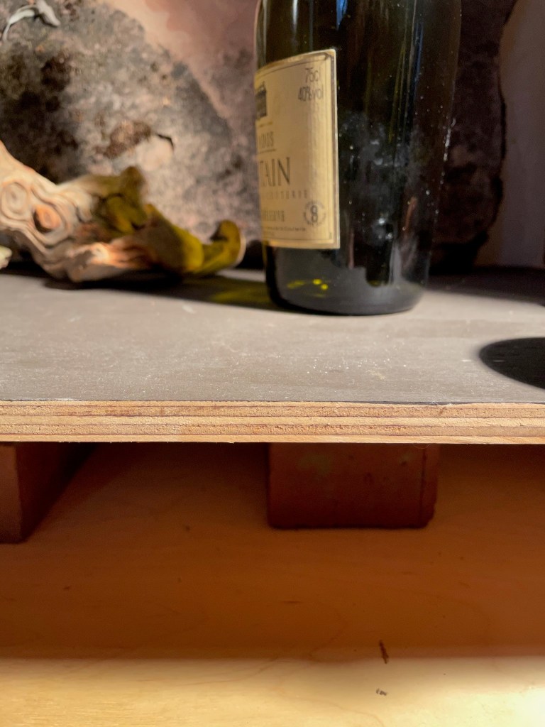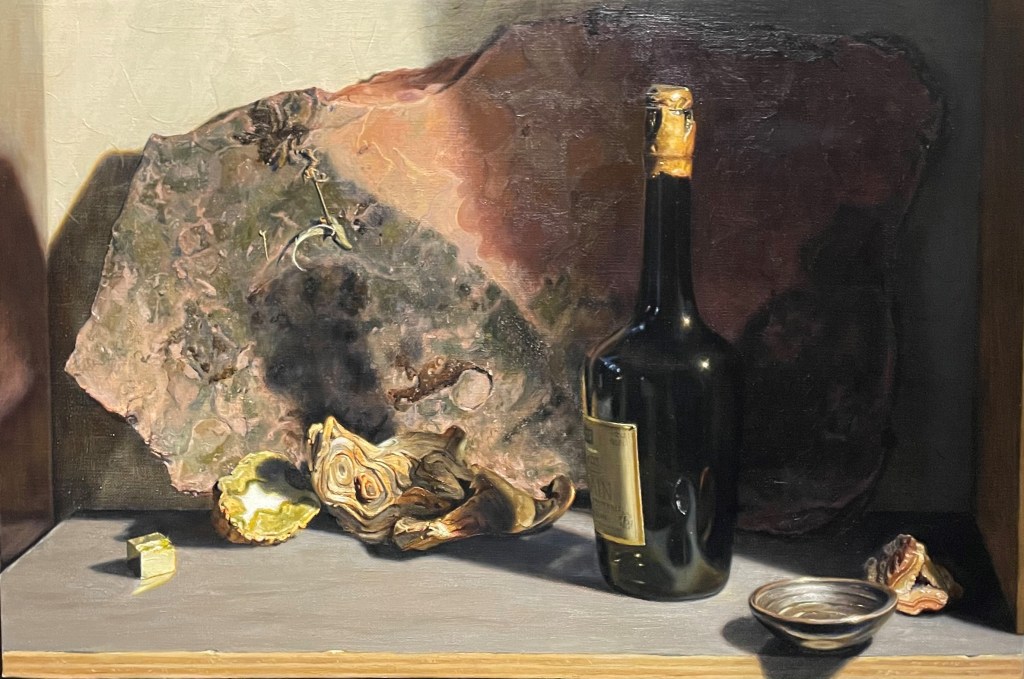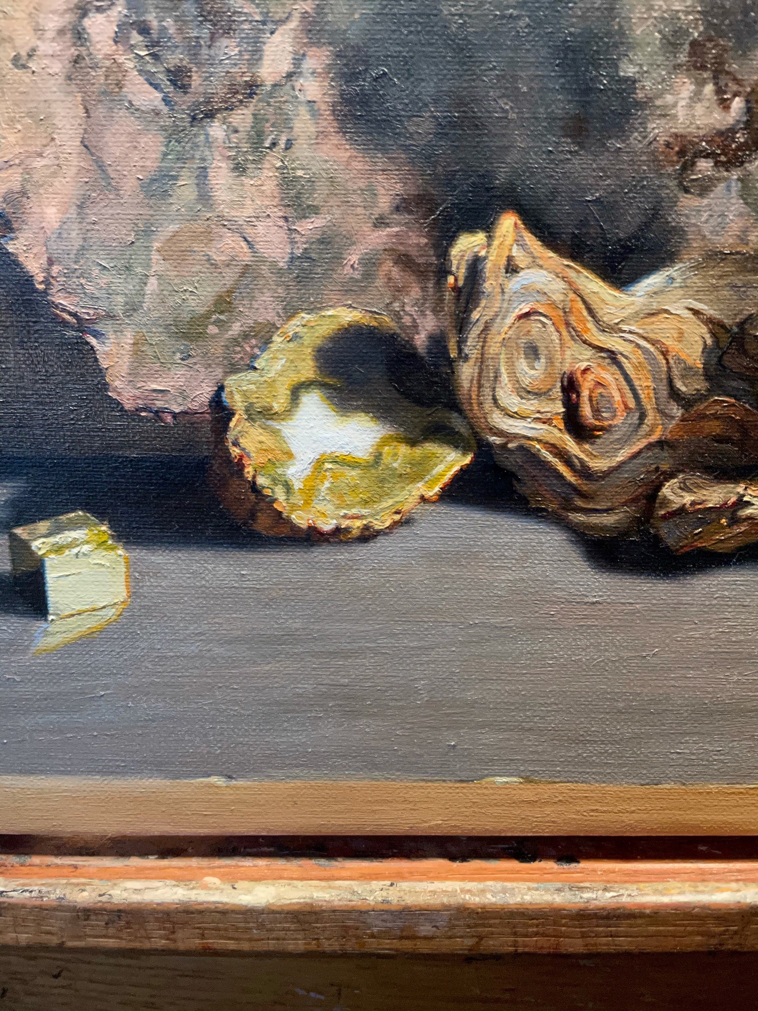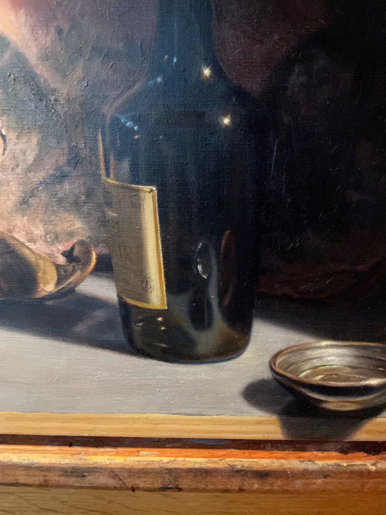 As I was studying the painting, I thought that maybe the tabletop edge needed more interest. I had painted a small ding in the edge to break up the line, but maybe this wasn’t enough.